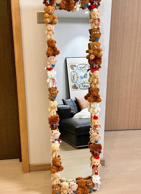 如果觉得家里的镜子比较单调,那么就可以把家里这些比较小的毛绒玩具,全都粘贴在镜子的四周。