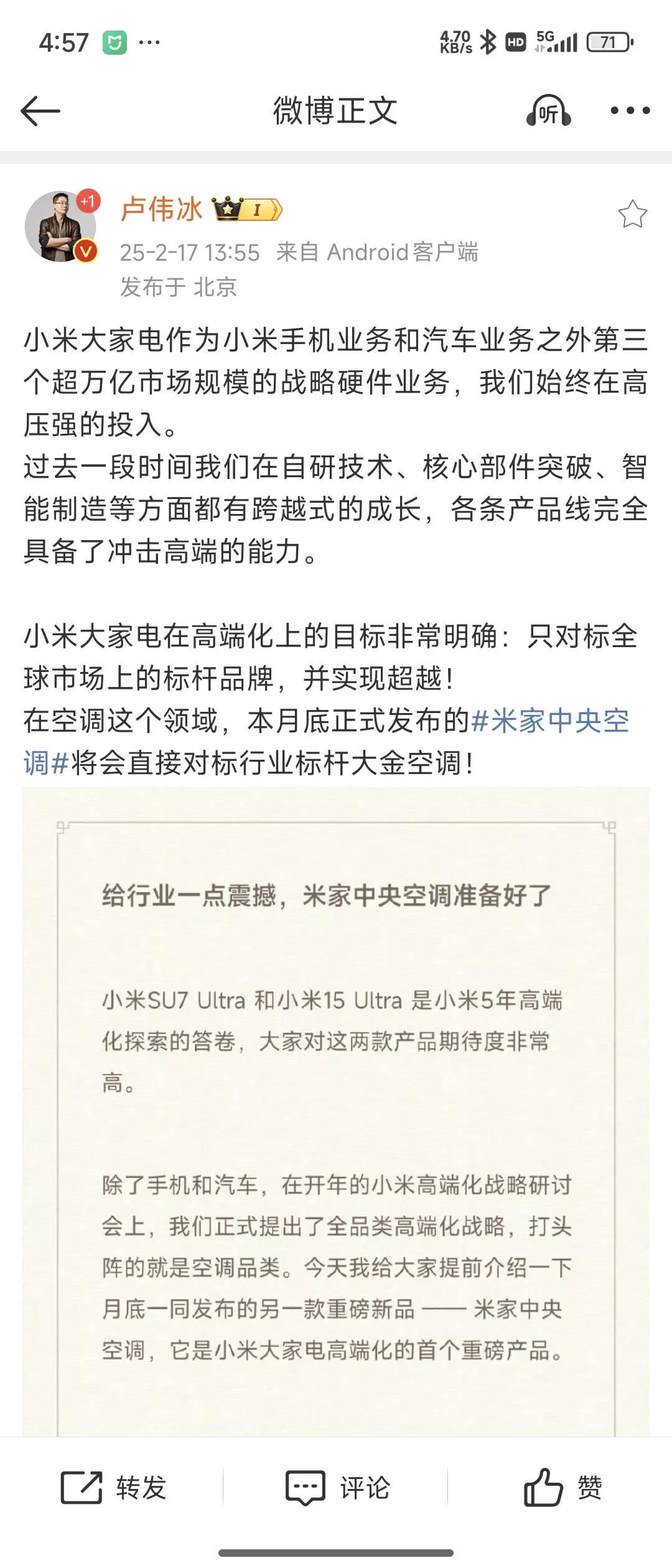 2月17日,小米集团合伙人、总裁,手机部总裁,小米品牌总经理卢伟冰发文表示,小米大家电要给行业一点震撼。