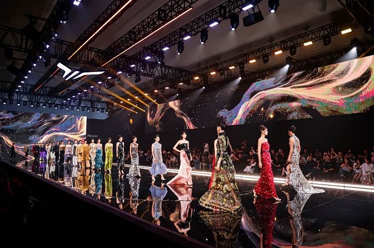 “扶摇直上,阔境天下”,岚图梦想家与岚图追光L在马尾绣与马面裙的时尚演绎中惊艳登场。非遗马尾绣传承人与当代设计师联袂,将岚图LOGO织入衣襟,呈现均衡却不对称的东方美学,传递“天人合一”的东方智慧。马面裙自古为骑行而生,如今在国际秀场焕新演绎,其祥瑞寓意代表着交通工具的跃迁与文明的传承。服装廓形宽展而从容,如鹏鸟展翅,象征MPV车型的大气格局与轿车产品的行云流水,这是对当代精英阶层生活方式的深度解读——在开阔中见细致,于从容中显不凡,岚图以东方美学原创设计正走向世界舞台并引领世界时尚。