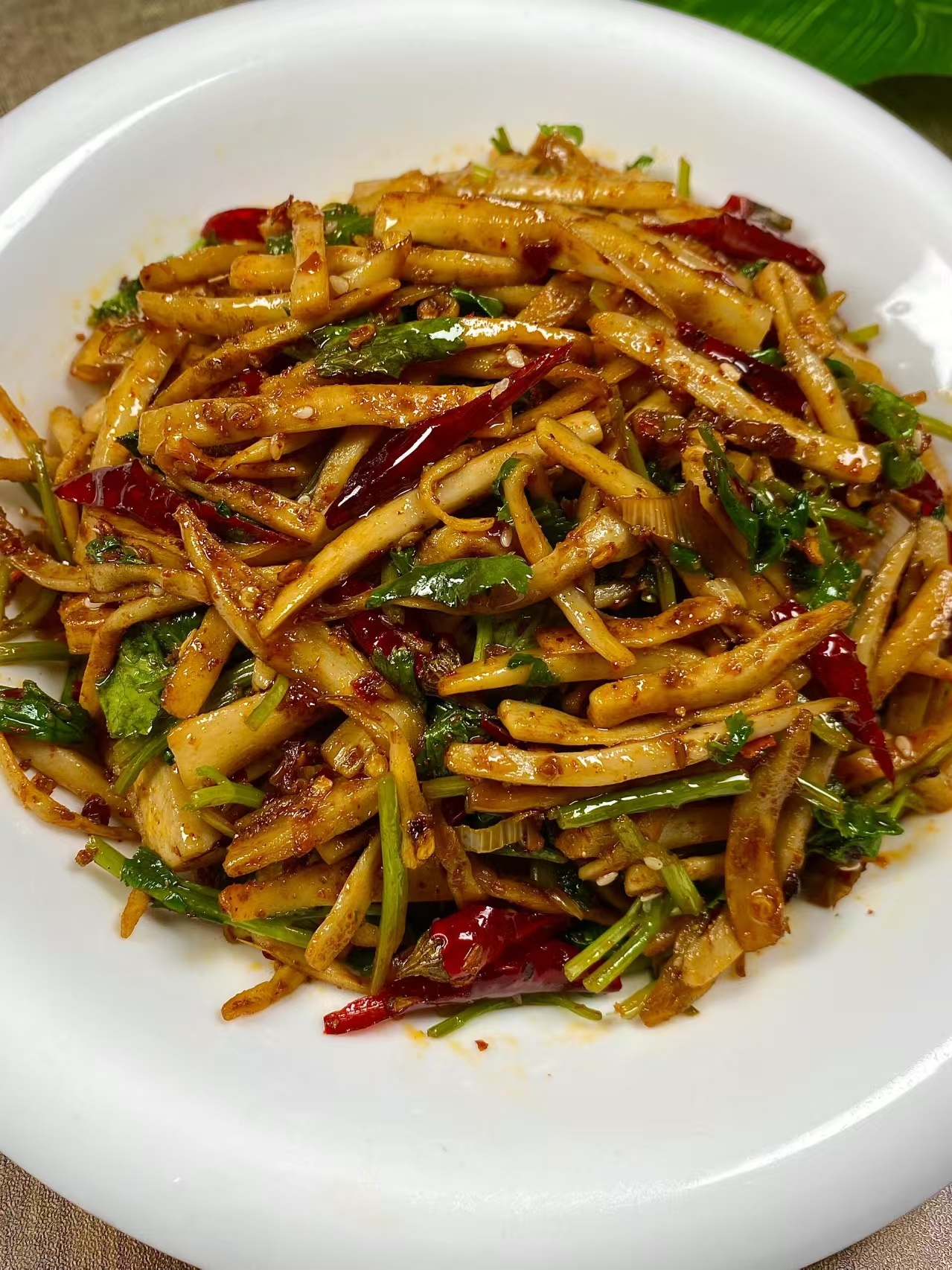 爆香调料:锅中留少许底油,放入蒜末、干辣椒段,小火爆香;加入辣椒面、孜然粉,翻炒 10 秒,炒出香料香味(火要小,避免炒糊发苦)。