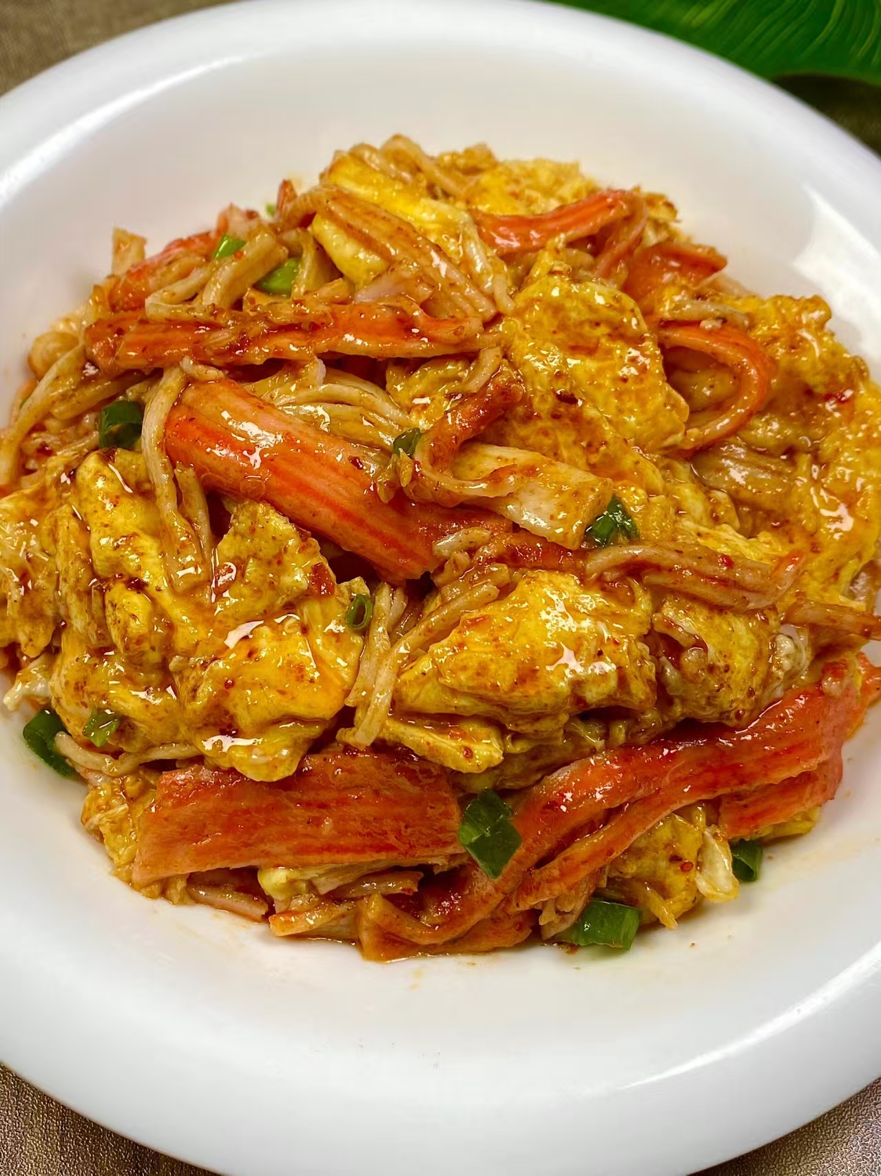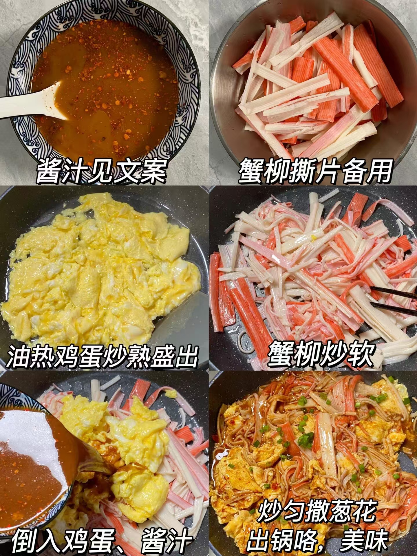 炒蟹柳 + 混合入味:锅中留少许底油,下入蟹柳丝,小火煸炒 1 分钟至微焦出香;倒入炒好的鸡蛋,淋入调好的酱汁,大火快速翻炒 30 秒,炒至汤汁收干、每根蟹柳都裹上酱汁。