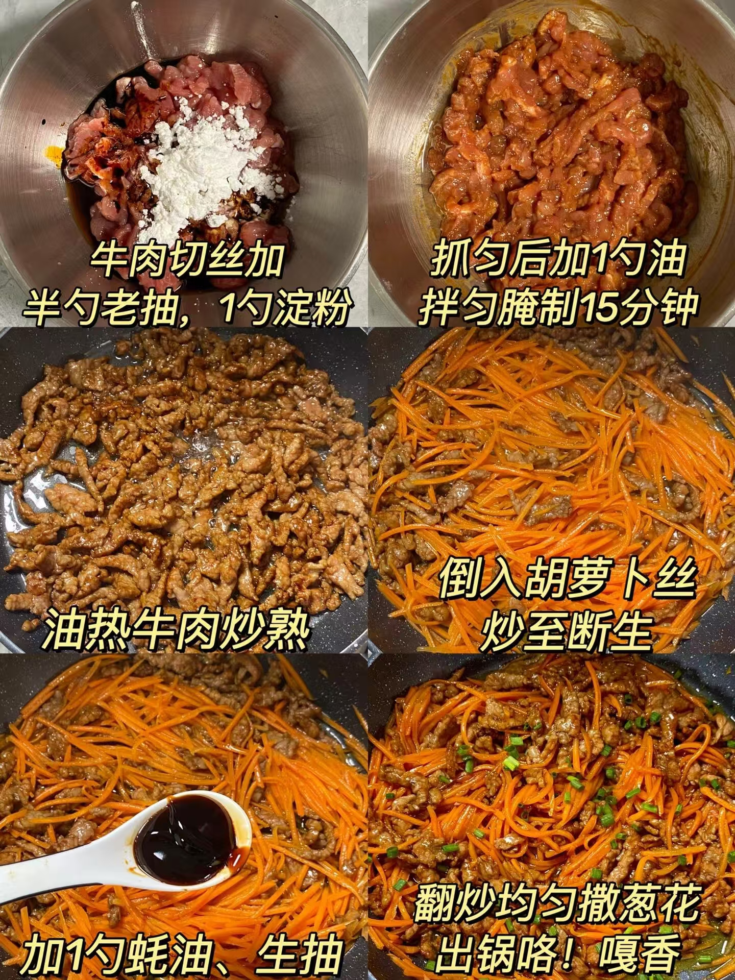 牛肉 200g(切细丝)、胡萝卜 1 根(约 150g)、葱花 1 小把、生抽 1 勺、老抽少许(上色)、蚝油半勺、淀粉 1 勺、食用油 1 勺、盐少许、料酒 1 勺
