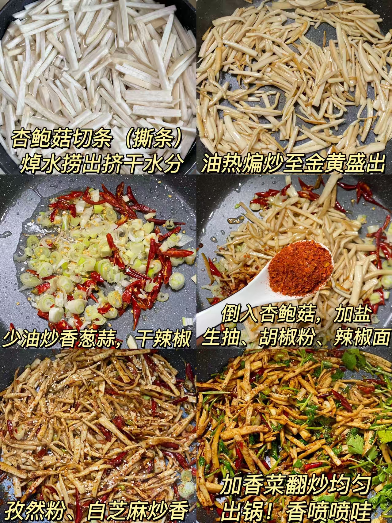 👉 小贴士:杏鲍菇一定要挤干水分,否则易吸油;香料用量可根据口味调整,喜欢淡口的可以减少辣椒面和孜然粉;全程少油,低脂更健康。