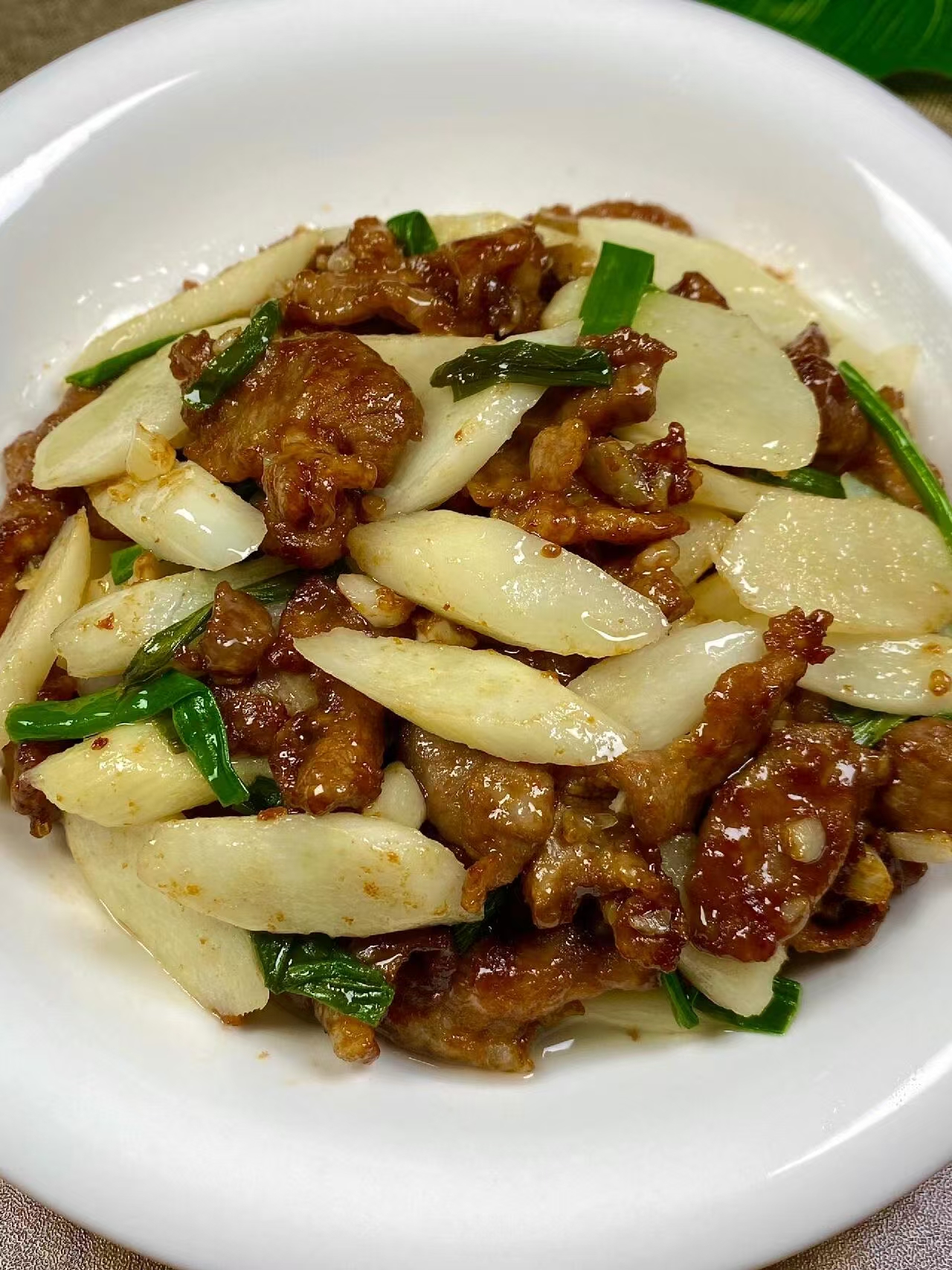 混合翻炒:锅中再倒半勺食用油,放入姜蒜末爆香;下入山药片,大火翻炒 1 分钟;淋入少许清水(或低脂高汤),焖煮 30 秒;倒回肉片,加入生抽、老抽、少许盐,放入葱段,大火快速翻炒 30 秒,让味道充分融合。