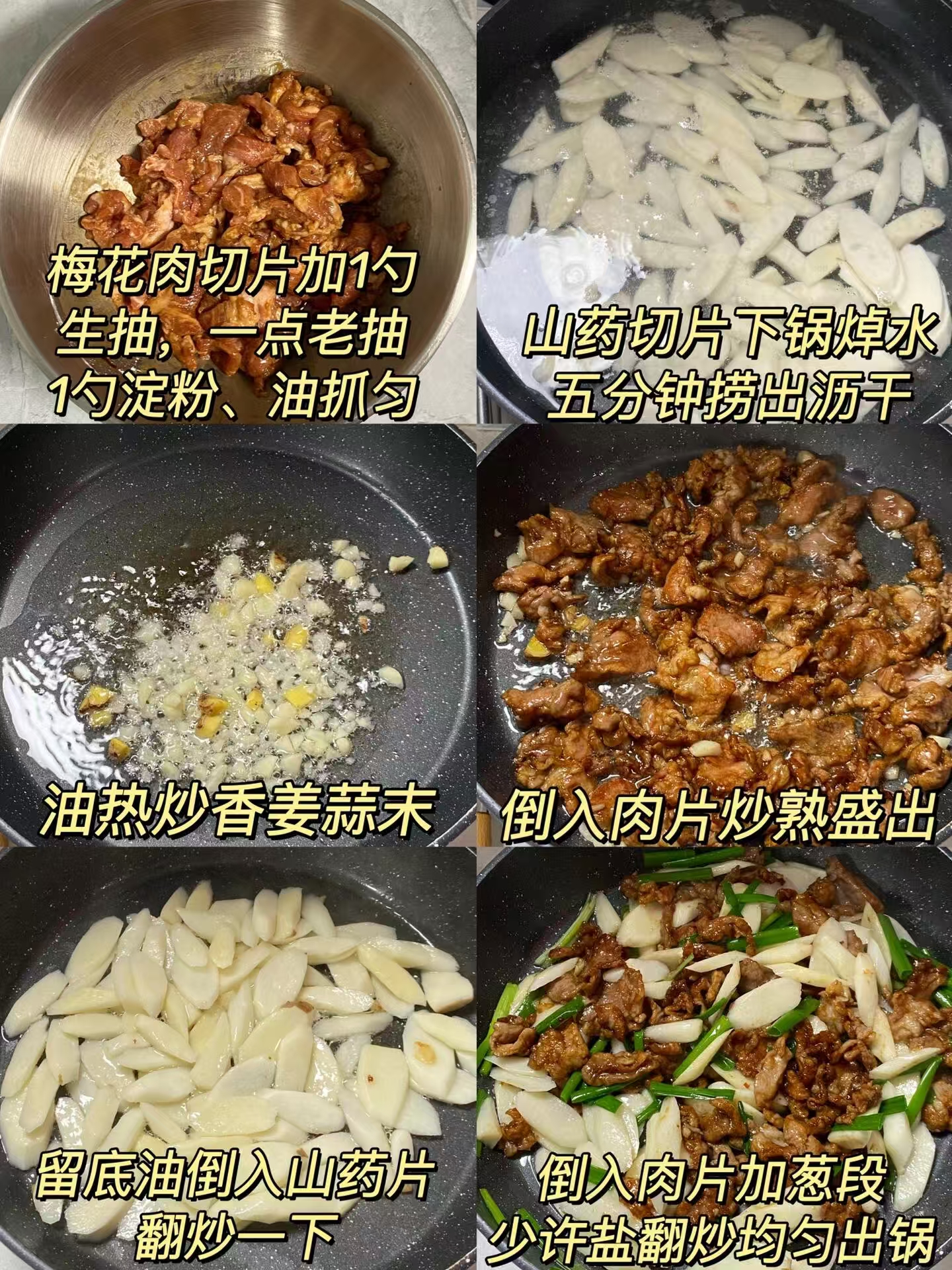 梅花肉 150g(切薄片)、山药 1 根(约 200g)、姜蒜各 2 瓣、葱段 1 小把、生抽 1 勺、老抽少许、淀粉 1 勺、食用油 1 勺、盐少许、料酒 1 勺、清水少许(或低脂高汤)