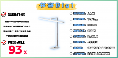 在性能配置上,书客Big可谓是比肩高端价位护眼灯。搭载五阶光学引擎,将传统台灯的亮度调节彻底升级为全场景护眼矩阵,真正实现为人眼量身定制的光环境。符合TM-30光标准,严苛10倍的显色指数把控,具备Ra98.6超高显色指数,CQS≥98旗舰指数,全面还原自然本色。可谓护眼灯中的六边形战士。中端价位直接入手这款就够了,性能无可匹敌!