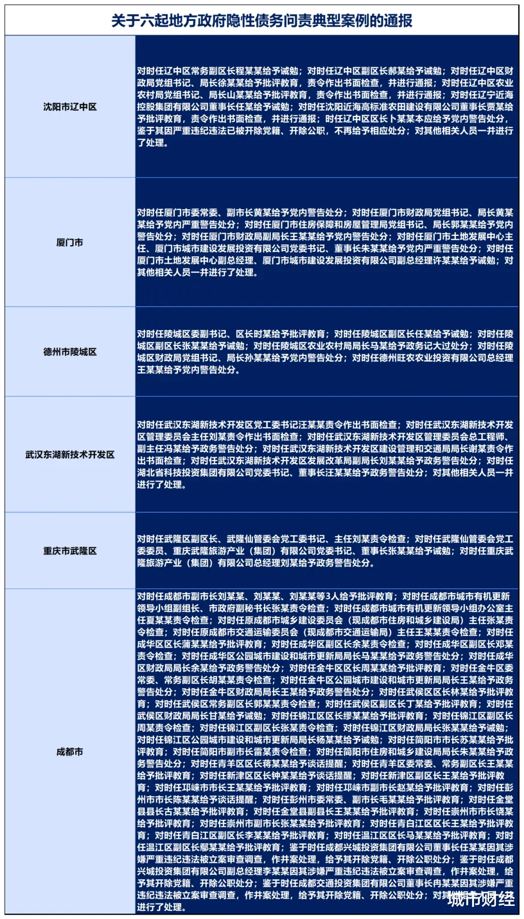 8月1日,财政部发布了《关于六起地方政府隐性债务问责典型案例的通报》,对沈阳辽中区、厦门、德州陵城区、武汉东湖新技术开发区、重庆武隆区、成都6个地方违规增加隐性债务进行通报、并问责。