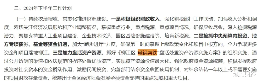 广西柳州柳江区提出的去年下半年工作计划中,就明确包括“砸锅卖铁”盘活处置资产实施方案。