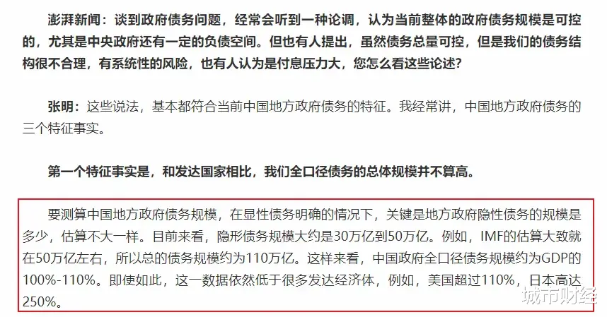 目前来看,隐形债务规模大约是30万亿到50万亿。例如,IMF的估算大致就在50万亿左右,所以总的债务规模约为110万亿。