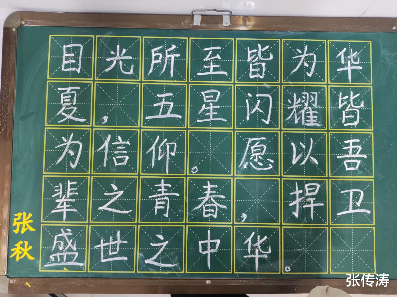 教师粉笔字展示活动在各年级同步开展,全校教师踊跃参与,以笔为媒传递教育温度。作品集中展示在教学楼各层大厅,从笔画规范到布局美观,每一处细节都彰显着老师们的扎实功底。一位老教师表示:“粉笔字是教师的基本功,我们希望通过这样的展示,不仅为国庆增添氛围,也给学生做好书写榜样,让他们感受汉字的魅力。”
