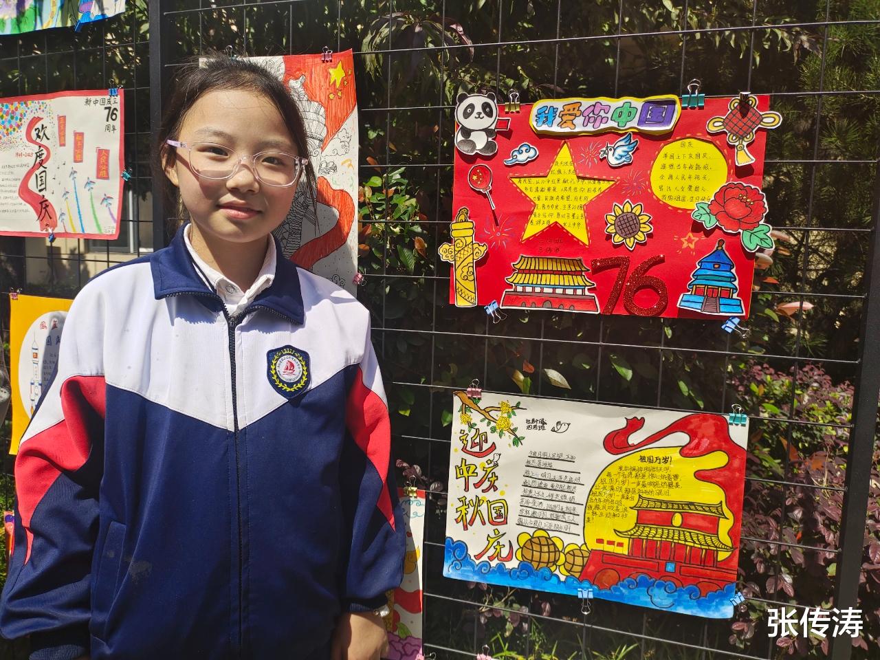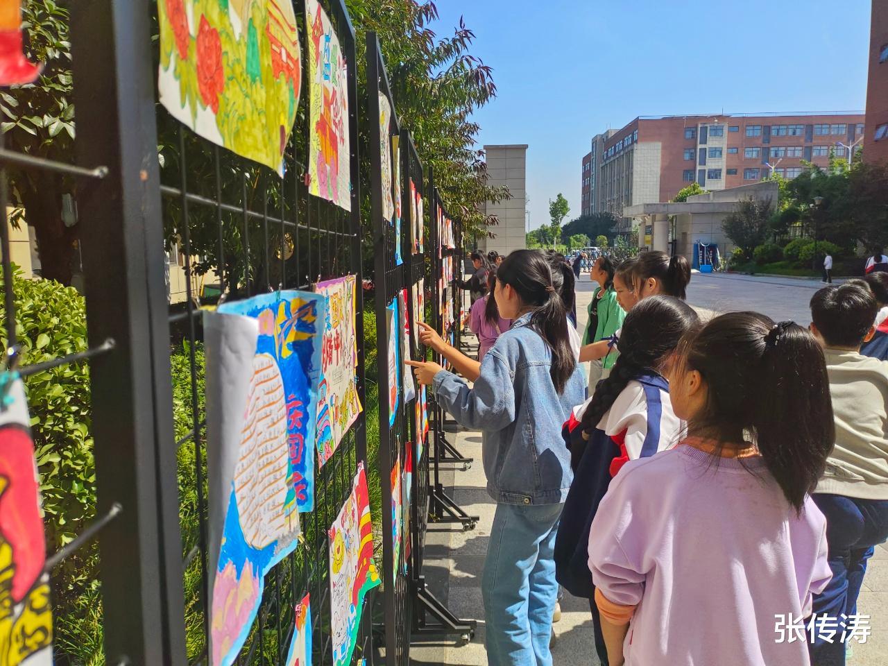 芳华广场上,“礼赞祖国、绘梦中华” 国庆节手抄报展同步开展。100余幅出自小学生之手的作品,整齐地贴在展架上,像一片五彩的“爱国画卷”,吸引着同学们下课就围过来观看。师生们一边看,一边交流自己最喜欢的作品,在一幅幅充满童趣的创作里,感受祖国的美好与强大。