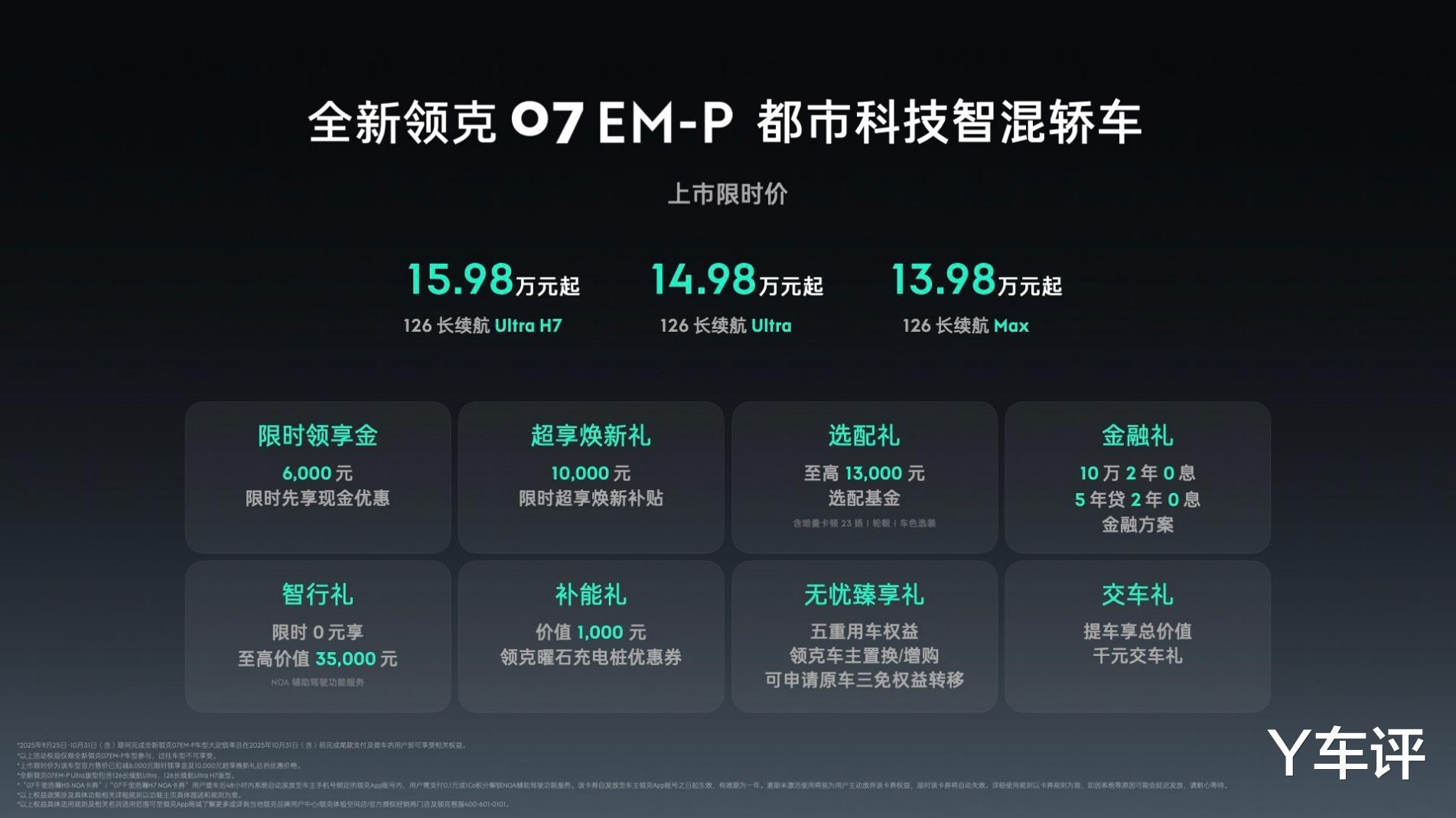 9月25日,领克科技智混轿车——全新领克07 EM-P正式上市。新车共推出126长续航Max、126长续航Ultra、126长续航Ultra H7三款配置版本,上市限时价13.98万元起。同时,全新领克07 EM-P还准备了限时领享金、超享焕新礼、选配礼、智行礼、补能礼等8重限时福利。