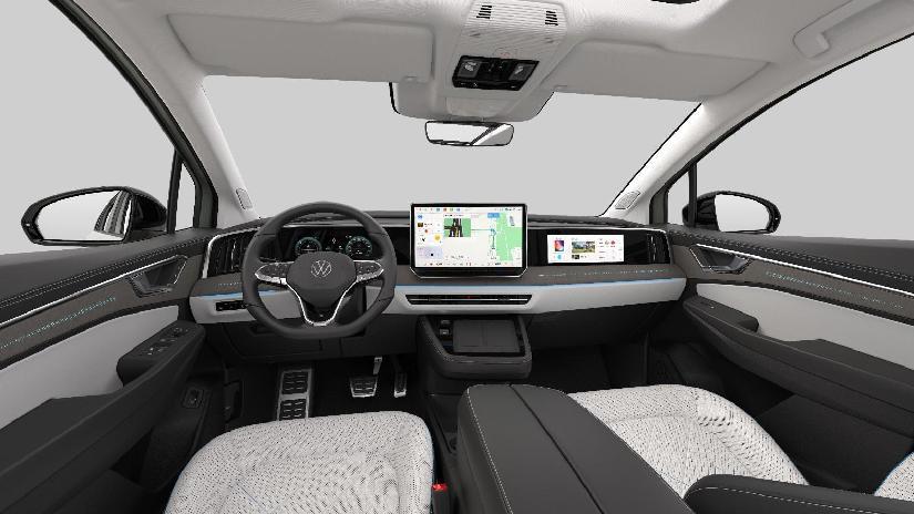 中控台采用怀挡设计,不仅释放出更多储物空间,更以简约布局提升了座舱的整体档次;而途昂 Pro 的内饰仍以黑色为主,硬塑料占比高达 50%,触感粗糙;单色氛围灯无法调节,夜晚车内氛围单调乏味,传统挡把设计也让中控区域显得杂乱,难以满足商务场景的质感需求。
