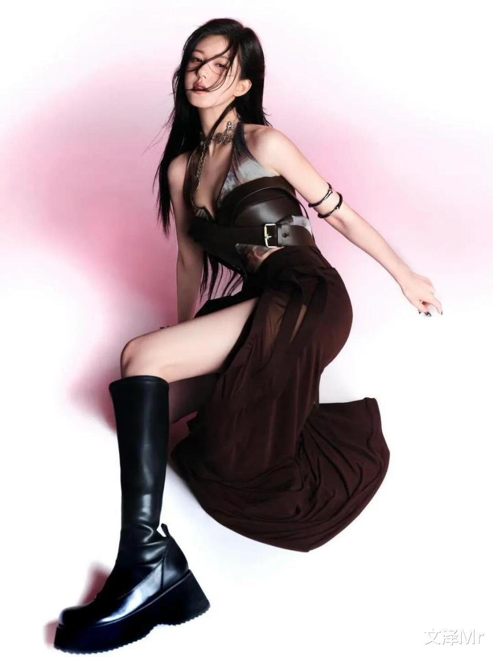 搭配黑色厚底长靴,瞬间拉长腿部线条,气场全开。开叉的裙装设计,若隐若现地露出腿部肌肤,性感又不失高级感。她坐在那里,姿态舒展,仿佛在告诉大家,甜妹也可以有如此 “拽姐” 的一面。