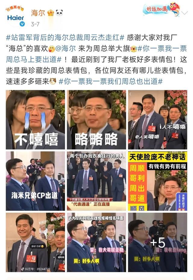 海尔的周云杰,也在今年两会期间,凭借一张与雷军的同框表情包意外走红。面对网友们的调侃,海尔官方不仅没有生气,反而积极下场互动,发布了全套周云杰表情包。这一系列操作,不仅化解了尴尬,还让海尔成功破圈。