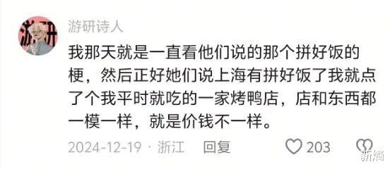 与这一变化同时出现的,还有用户口风的转变。从全网玩梗“吃拼好饭吃的”,到“打工人最后的兜底”的真香平价,拼好饭在社交平台上的口碑正在经历一场两极反转,用户和骑手开始自发为它正名:“店和东西都一模一样,就是价钱不一样。”