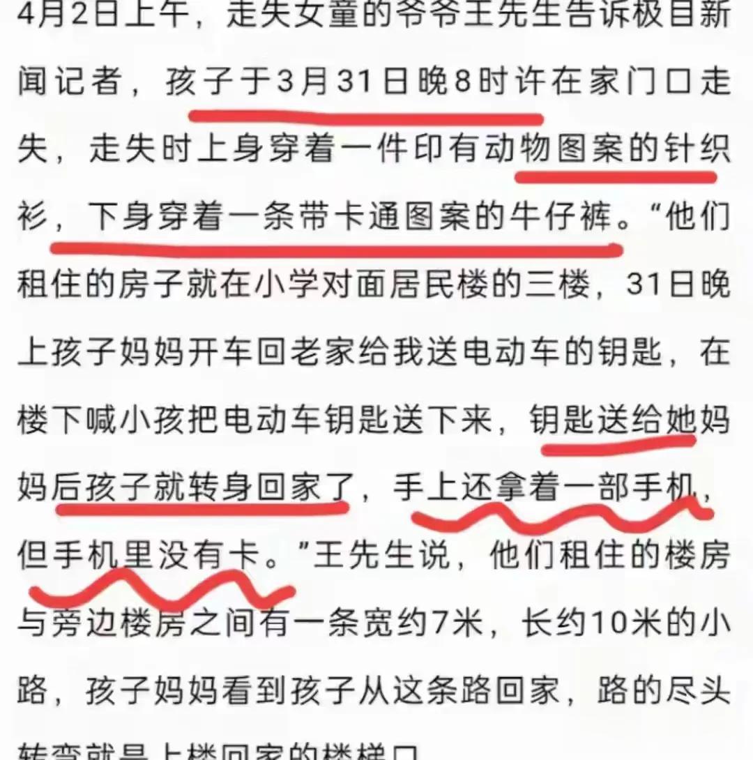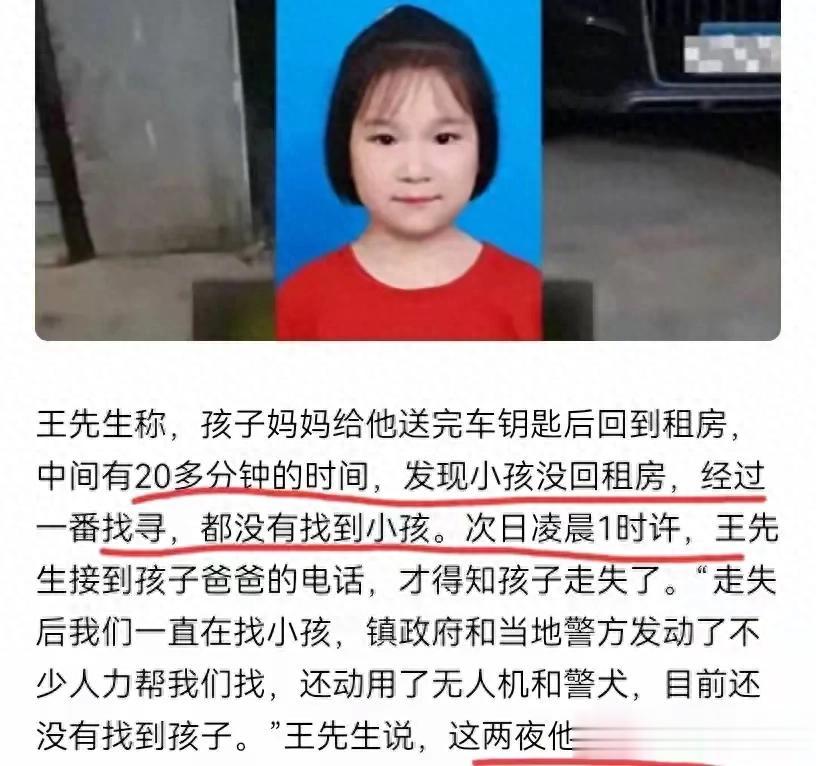 这个6岁女孩,晚上8点左右给妈妈送完钥匙,最后画面拐进胡同后便没了影。从她离开家人视线到发现她不见了,只隔二十分钟左右。当地出动大量人员、无人机,甚至动用警犬,还是没找到。