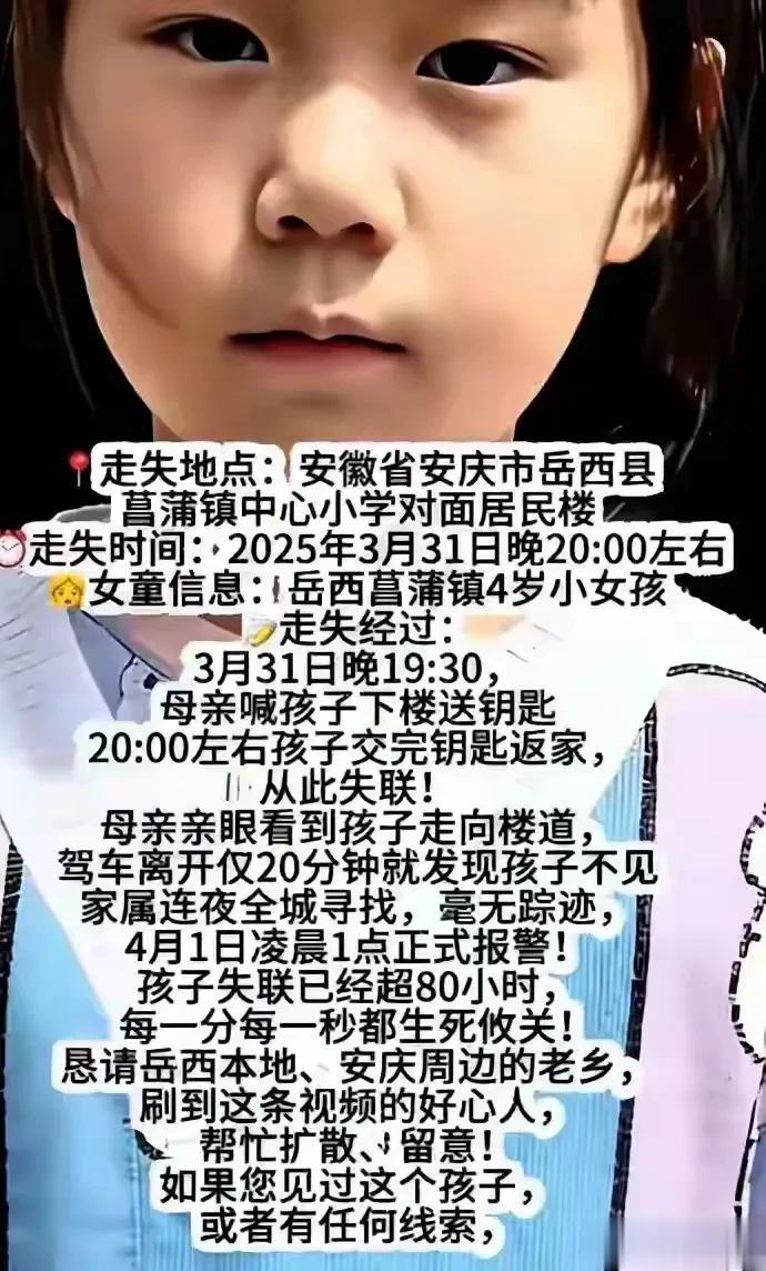 安徽6岁女童失踪已有多日,就在家门口短短几分钟不见踪影,至今没有找到。让人后背发凉。