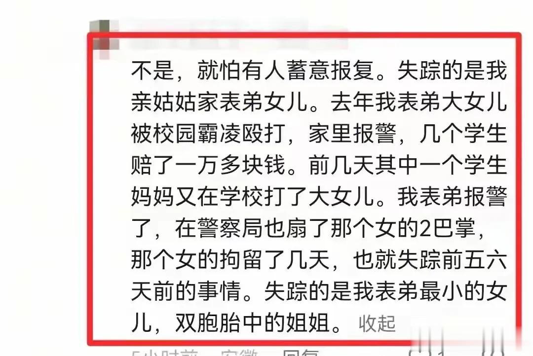 女童父亲透露最关键的一点,女童姐姐最近在学校出了两次矛盾,去年被同学欺负,家里报了警,对方赔偿了一万多块钱。就在女童失踪前五六天,她姐姐和 那个同学家长起冲突被打,家长被警方拘留。