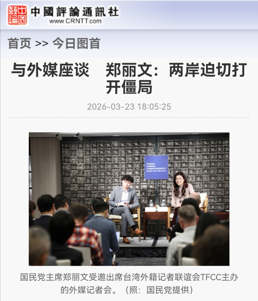 3月23日,国民党主席郑丽文在台北举行的“台湾外籍记者联谊会(TFCC)外媒记者会”上,强调国民党的两岸关系立场和对美军购态度,及必须赢得2026和2028年选举的原因等。