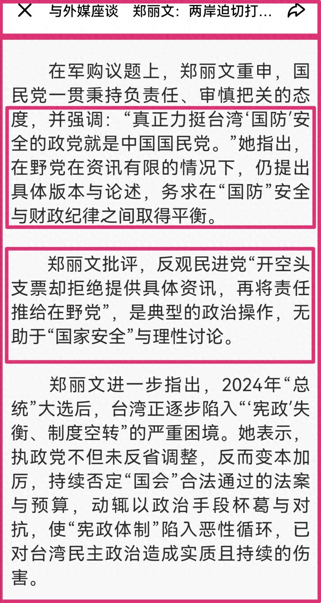 中国评论通讯社报道中显示,关于对美军购预算,郑丽文强调国民党才是真正力挺所谓“国防”安全的政党;批评民进党只是“开空头支票,还拒绝提供具体资讯,再将责任推给在野党”,属于典型的政治操作,无助于所谓“国家安全”与理性讨论。