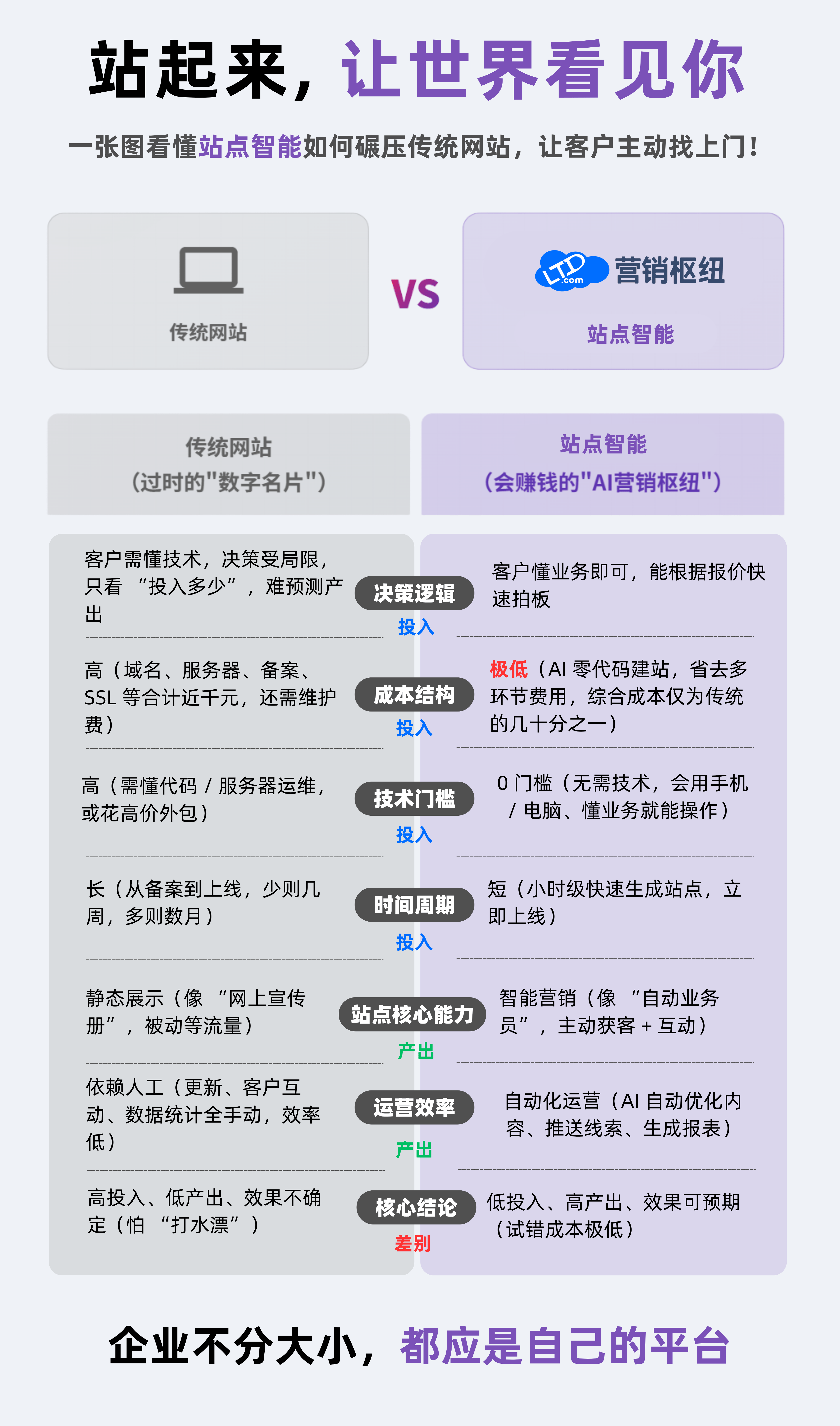 而 AI站点“低投入、高产出、效果可预期”,试错成本极低。从投入到产出,从技术壁垒到全民可用,再到长期价值的构建,AI站点与传统网站的差异,不仅是技术层面的迭代,更是营销思维的革新。