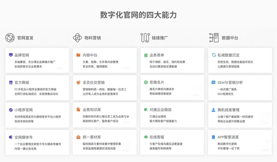 而AI站点契合数字化官网趋势,具备 “官宣、物料、链接、数据” 四大基础能力,能实现 “业务在线、用户在线、成员在线、数据归集”。在物料营销上,有统一素材库、全员营销赋能及业务知识库;链接推广可对接企业微信 / 在线客服、优化 SEM、一键分发全网媒体号;数据中台能沉淀私域数据、监控访客轨迹、管理商机线索,数据全链路可控,为企业营销决策提供有力支撑。