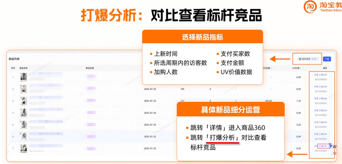 通过新品分析和打爆分析的组合,我们就可以直观的掌握全店新品数据,并通过对标对应的标杆商品,参考同行爆品的运营节奏,实现本店新品的运营打爆。