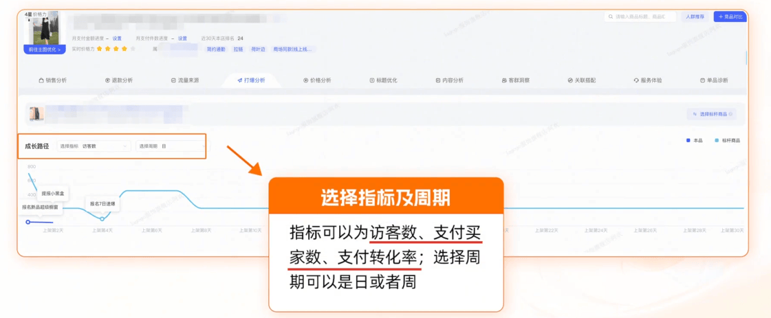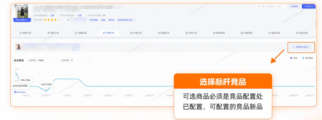 选定标杆商品和数据指标后,我们就可以看到在特定周期内标杆商品的运营节奏和数据起伏。比如标杆商品先后报名参加了新品超级橱窗、天猫小黑盒和7日速报活动,在上新第1天和上新第5-7天获得了较大的访客增长。结合标杆商品的关键运营动作,我们可以把竞品的打法融入到本店的新品运营计划中,以获得更多新品增长机会。