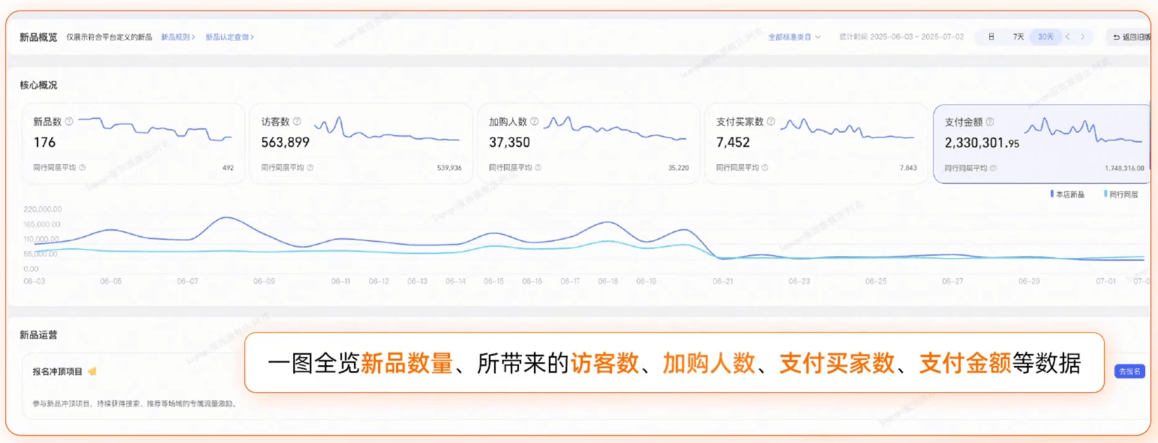 在新品分析的首页,我们可以看到所有新品数据的核心概况,包括新品数量、所带来的访客数、加购人数、支付买家数、支付金额等。
