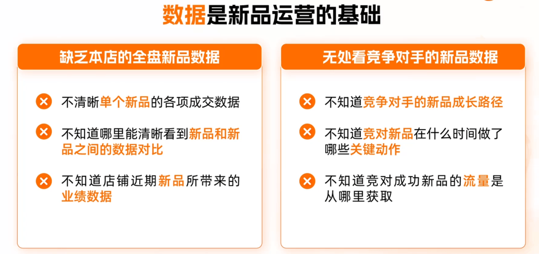 第二是竞品的新品数据看不到,当自家新品表现不好时,大家可能下意识会去参考同行怎么打的,竞争对手在新品上做了哪一些关键动作,报名参加了平台的哪些活动,从哪些渠道获取流量,数据看不懂、有了不会用,成为很多商家实现新品打爆的第一只拦路虎。