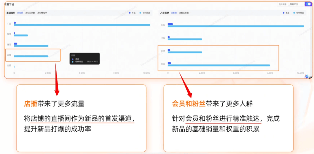 打个比方,我们发现竞品的渠道结构中很多的流量来自店铺自播,那我们可以考虑是不是将店铺的直播间做新品首发渠道,提升新品打爆的成功率。如果发现竞品的人群贡献中会员和粉丝的比重较大,那就可以针对会员和粉丝进行精准触达,完成新品的基础销量和权重的积累。