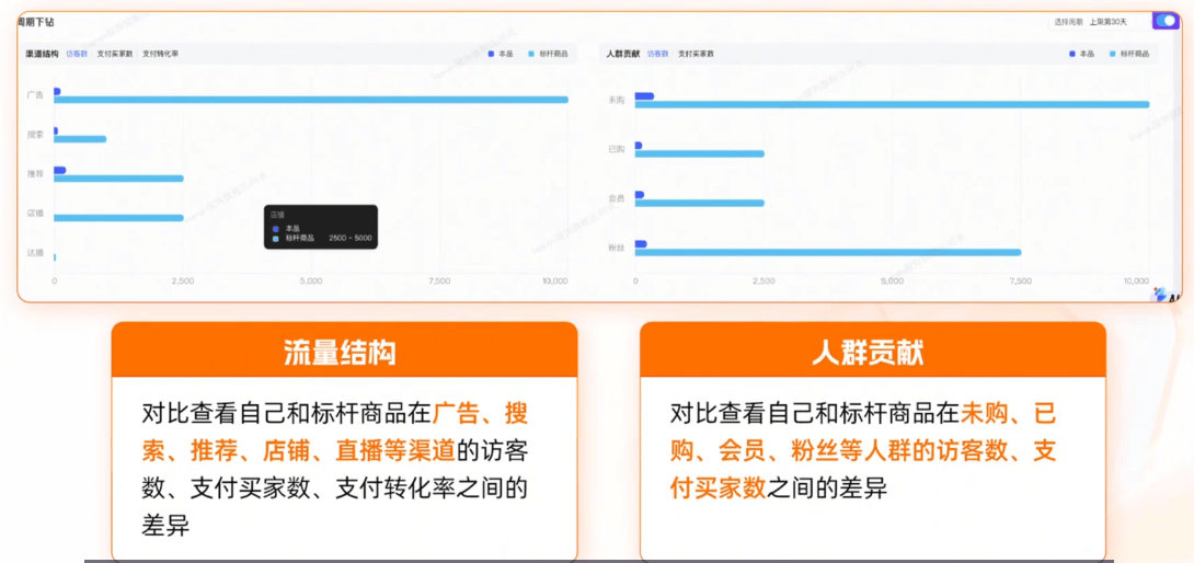 除了关键运营动作之外,我们还可以进一步通过打爆分析,对比分析本店新品和标杆商品的流量结构和人群贡献。