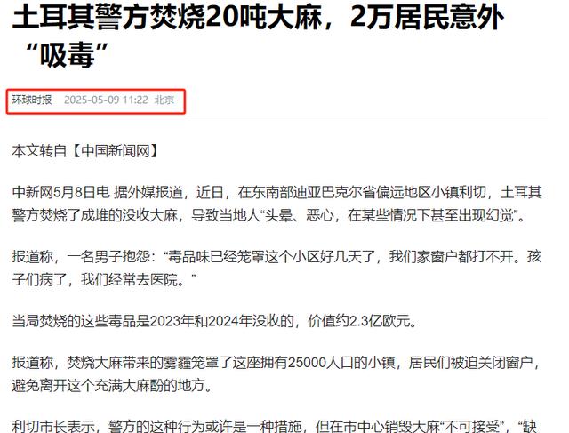 信源:环球时报 2025年5月9日 关于“土耳其警方焚烧20吨大麻,2万居民意外“吸毒””的报道