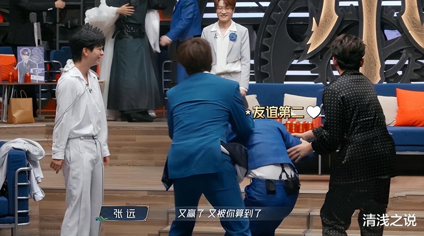 苏醒不仅是语言上酸,还付诸行动了,把张远叫上,一起上前“揍”李承铉——上,扁他,太离谱了。又是他,又赢了,又被你算到了。这简直是红眼病大爆发呐,比赛第一,友谊第二嘛。而除了快乐老咖酸,大湾仔也酸,上一公大家还是同盟,彼此共进退,这一公竟然差距那么大,人家押中十分,自己押中零分,也酸得“动手”——扔扇子。