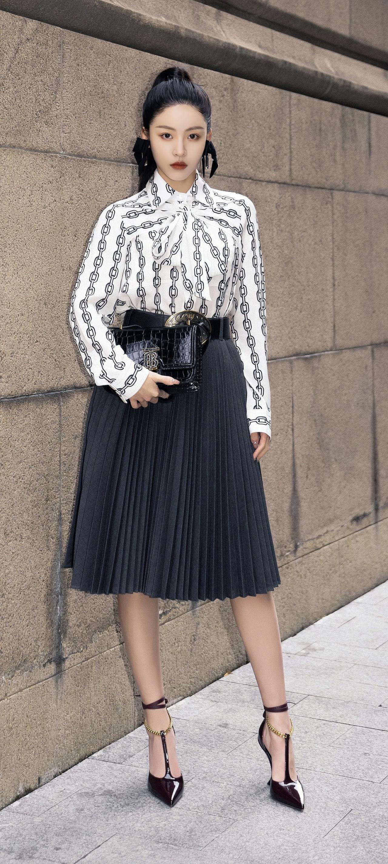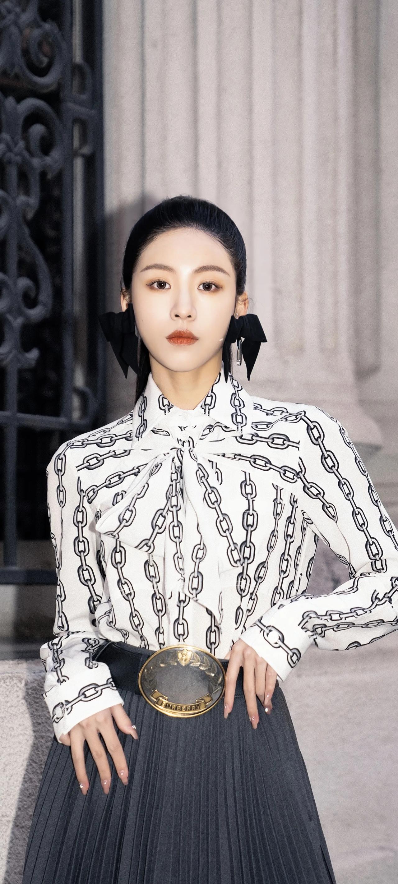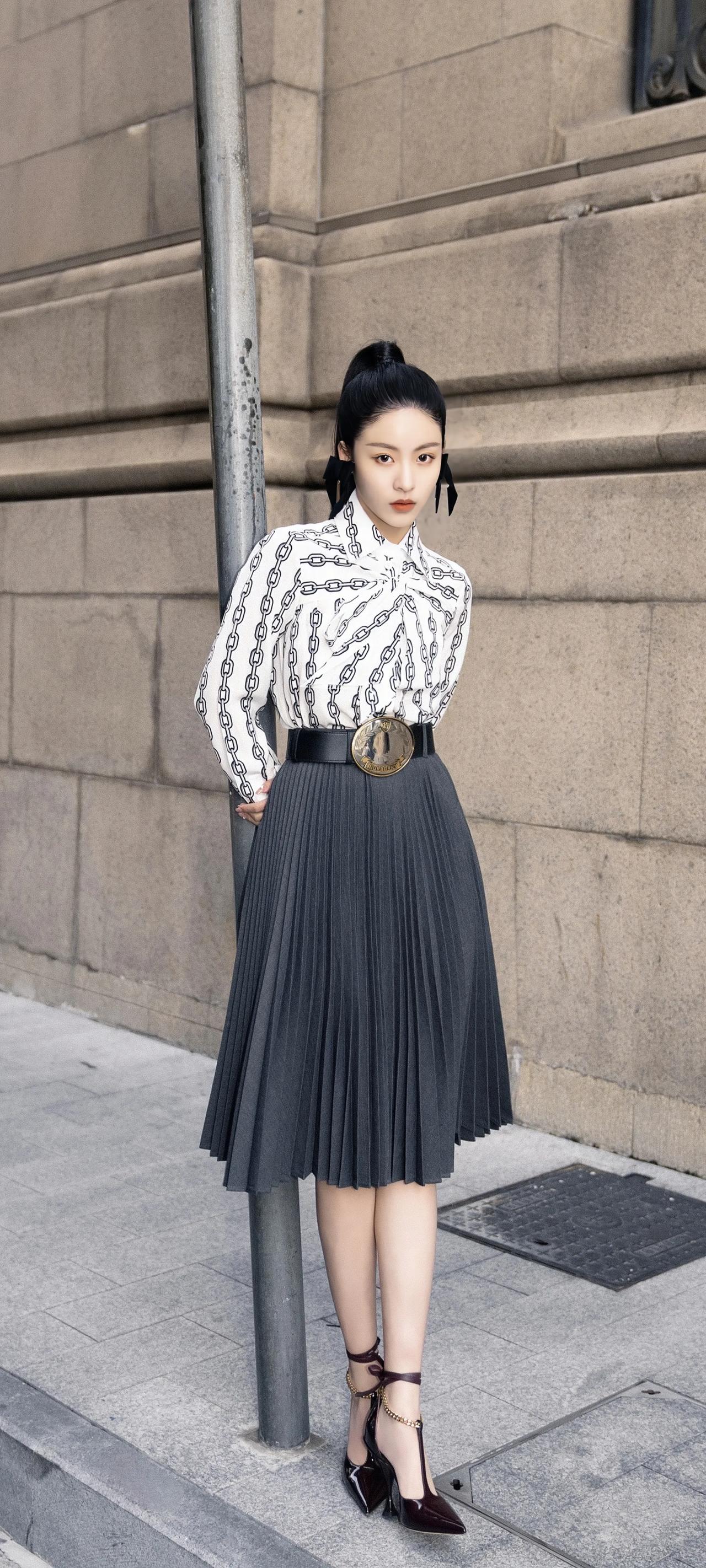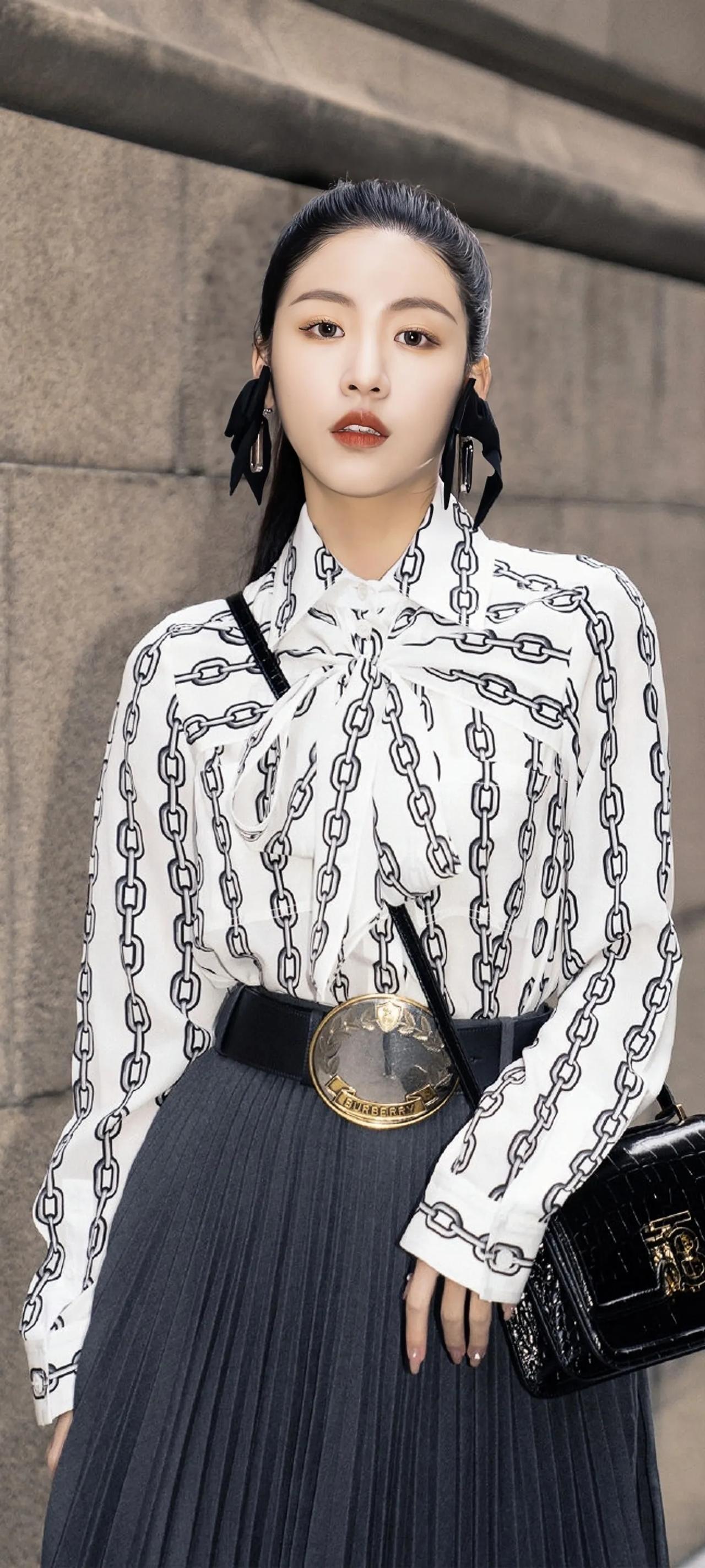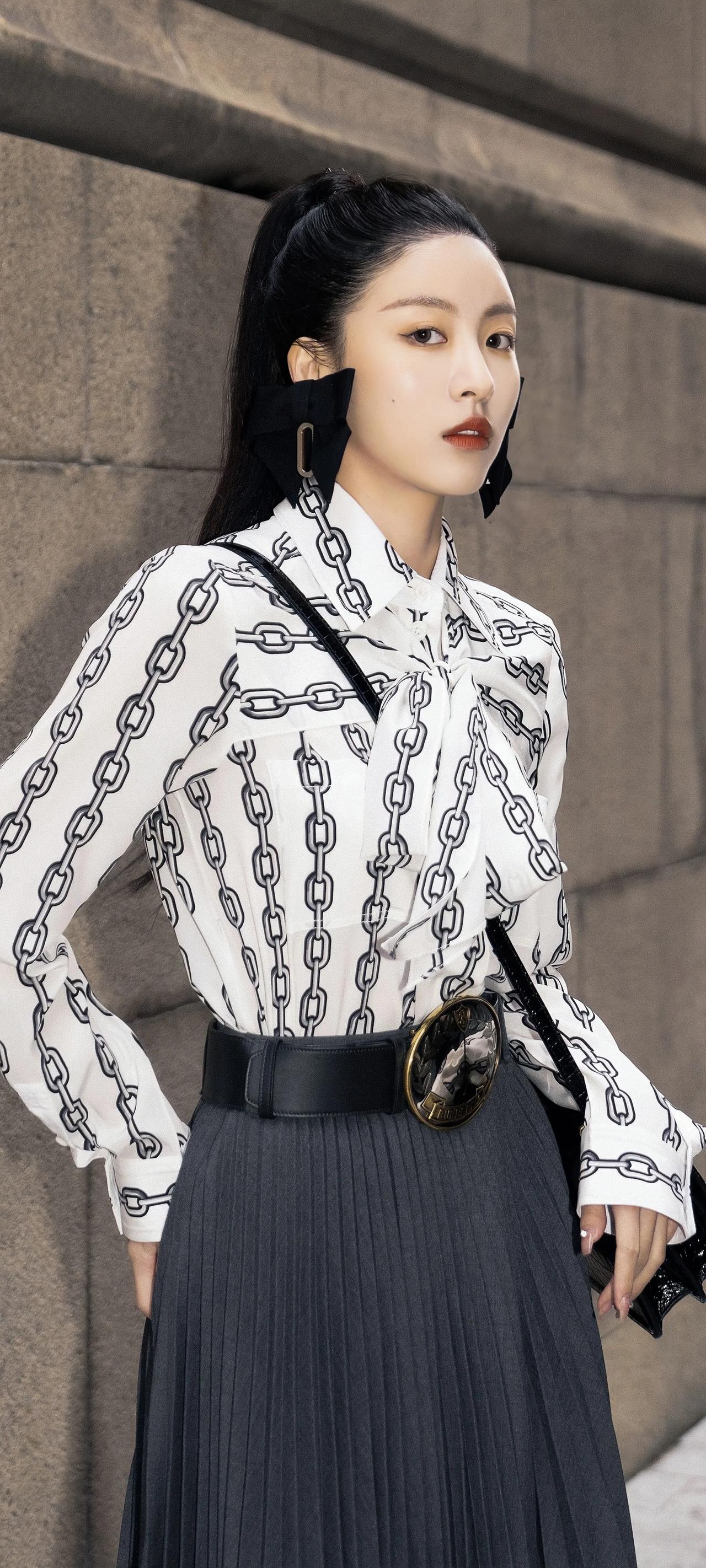 链形印花系领衬衫,半裙褶边裁片短裤,轻盈的摩登探索者。 孙芮 娱乐