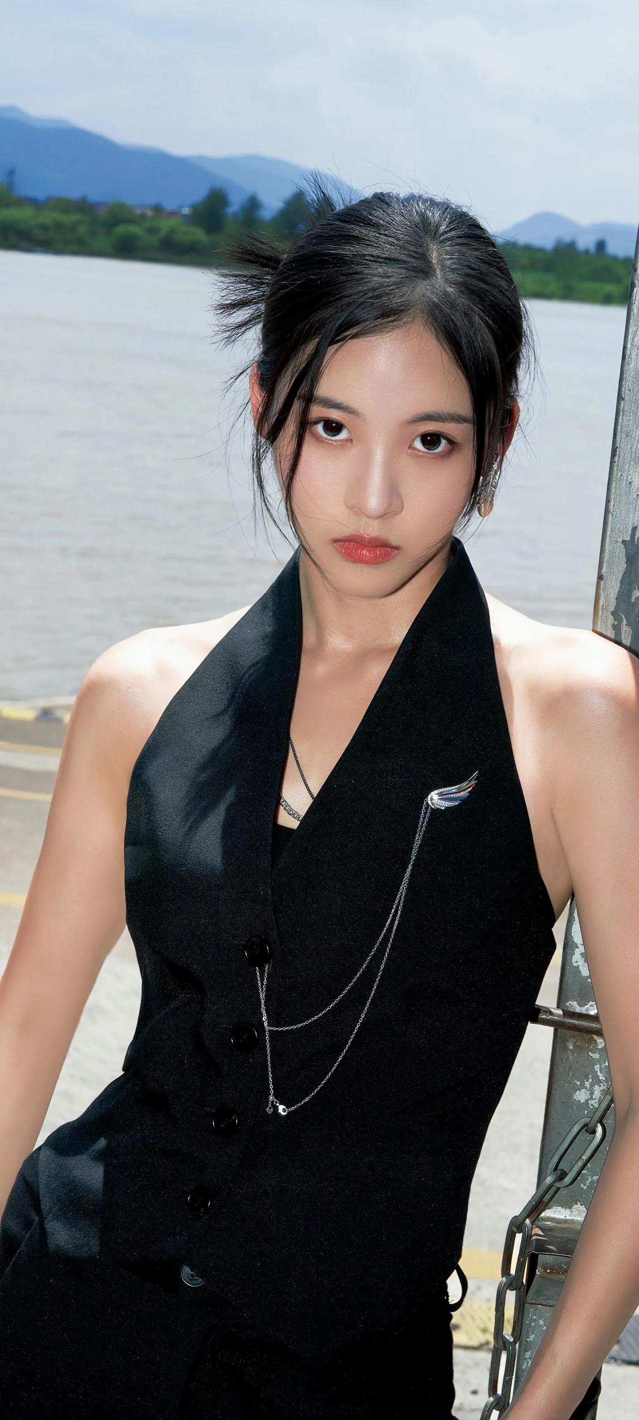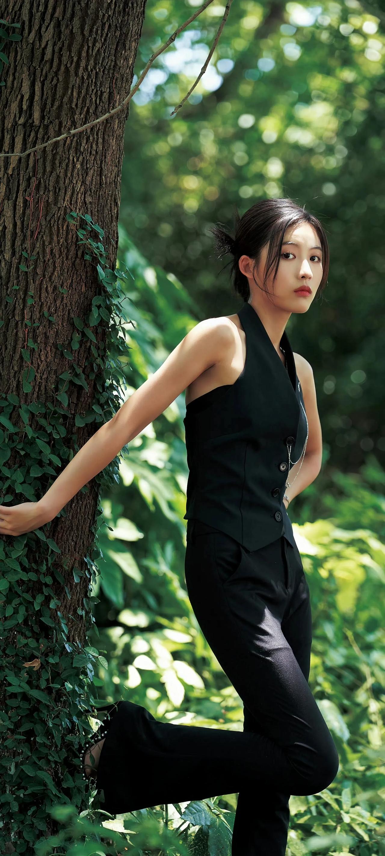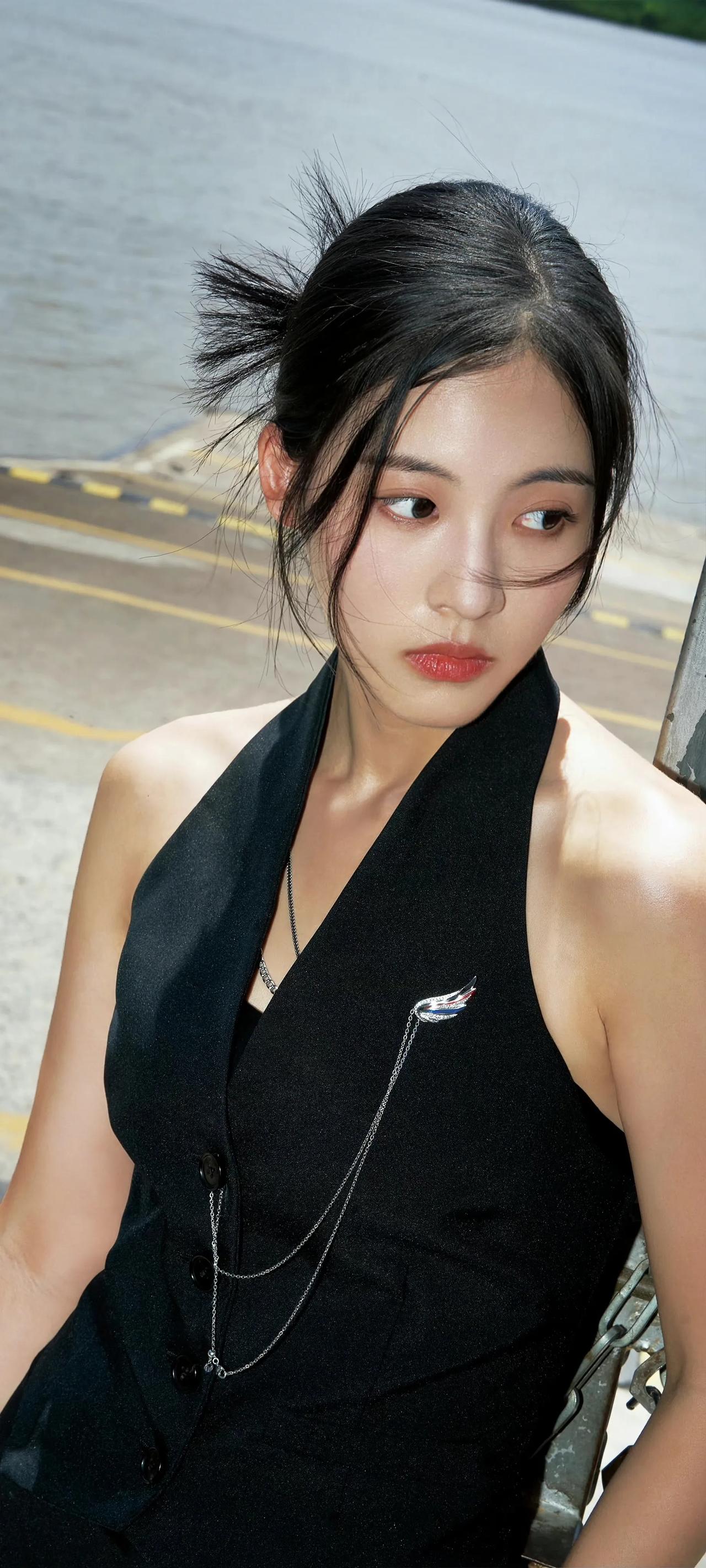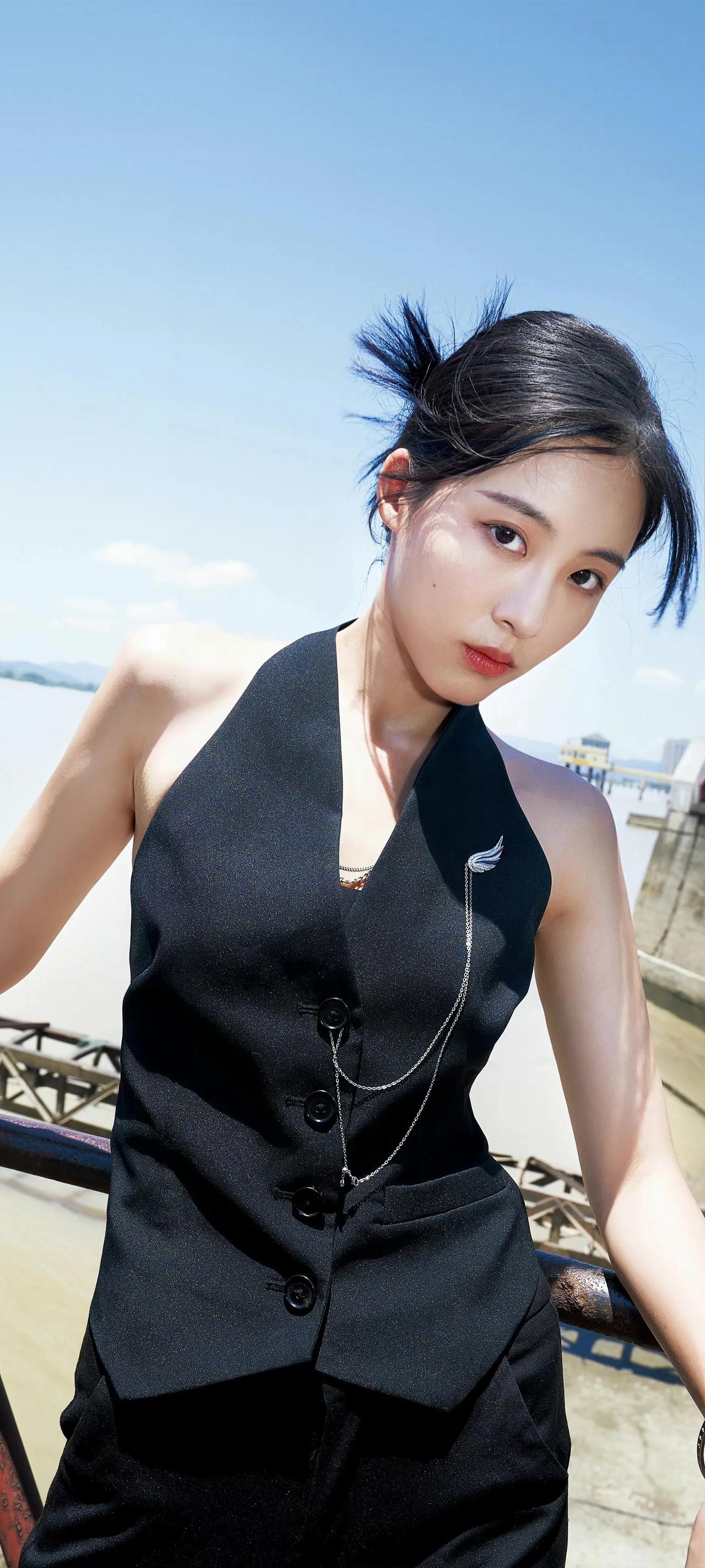 孙芮黑色挂脖马甲与阔腿西裤,搭