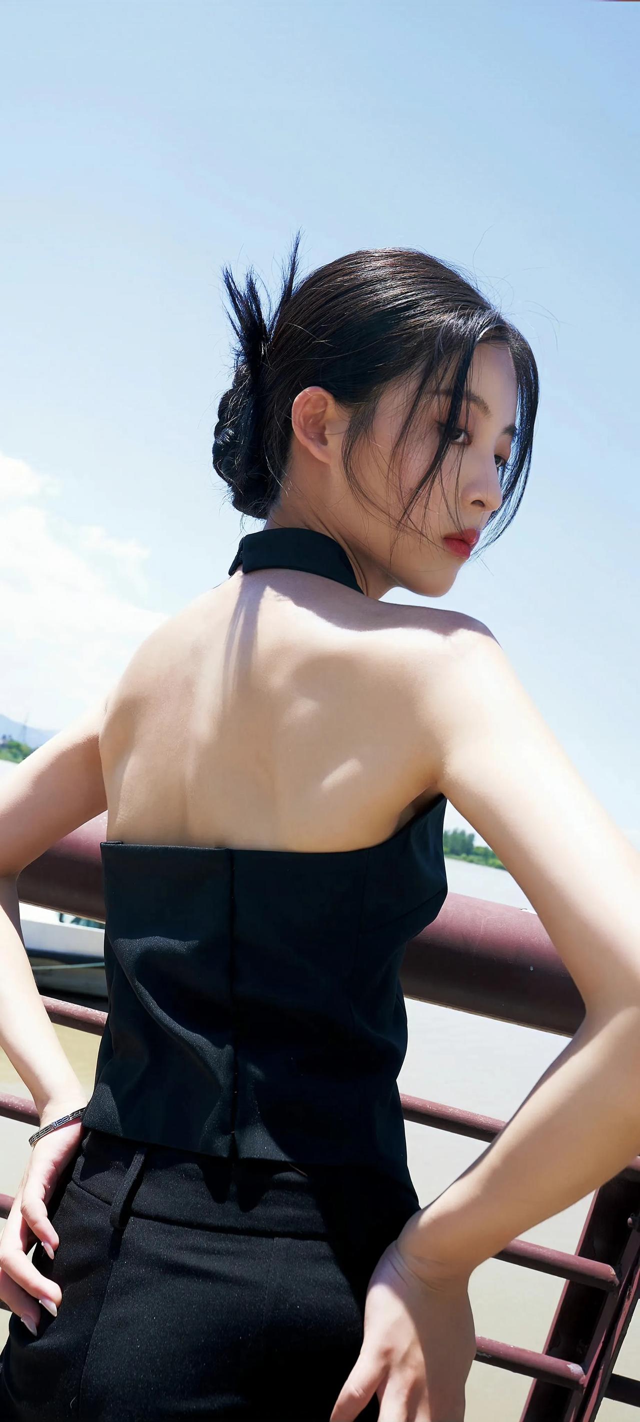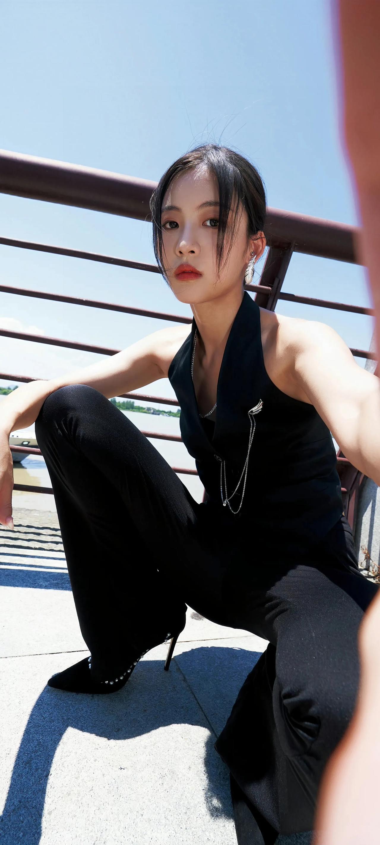 孙芮黑色挂脖马甲与阔腿西裤,搭配同色磨砂皮高跟鞋,酷感造型动人魅力,步履间熠熠生姿。 孙芮 娱乐