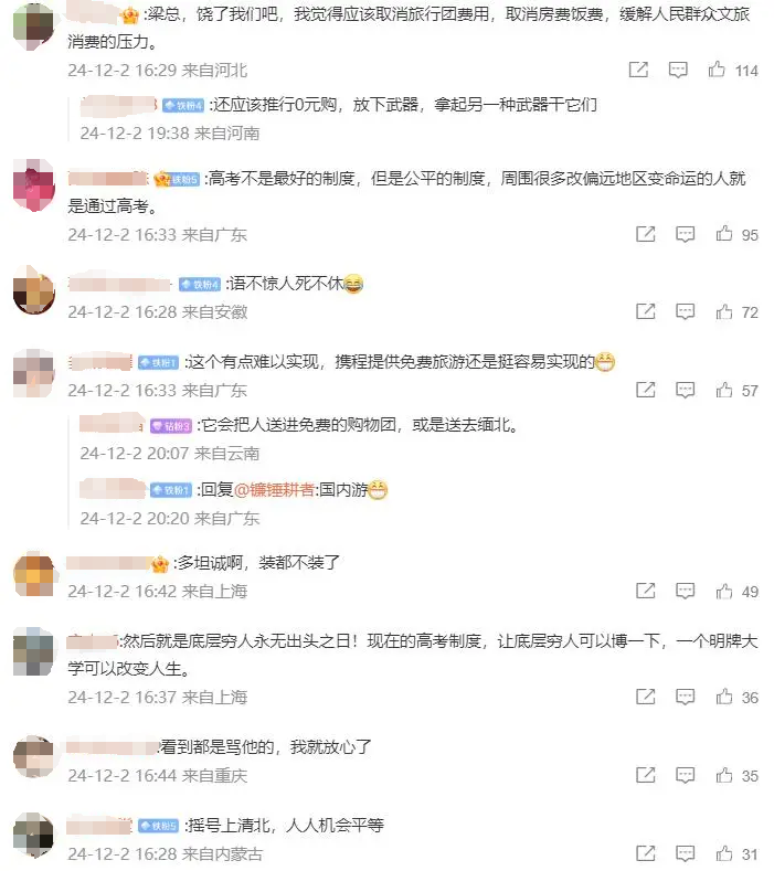 还有网友称,梁总饶了我们吧,我觉得应该取消旅行团费用,取消房费饭费,缓解人民群众文旅消费的压力。