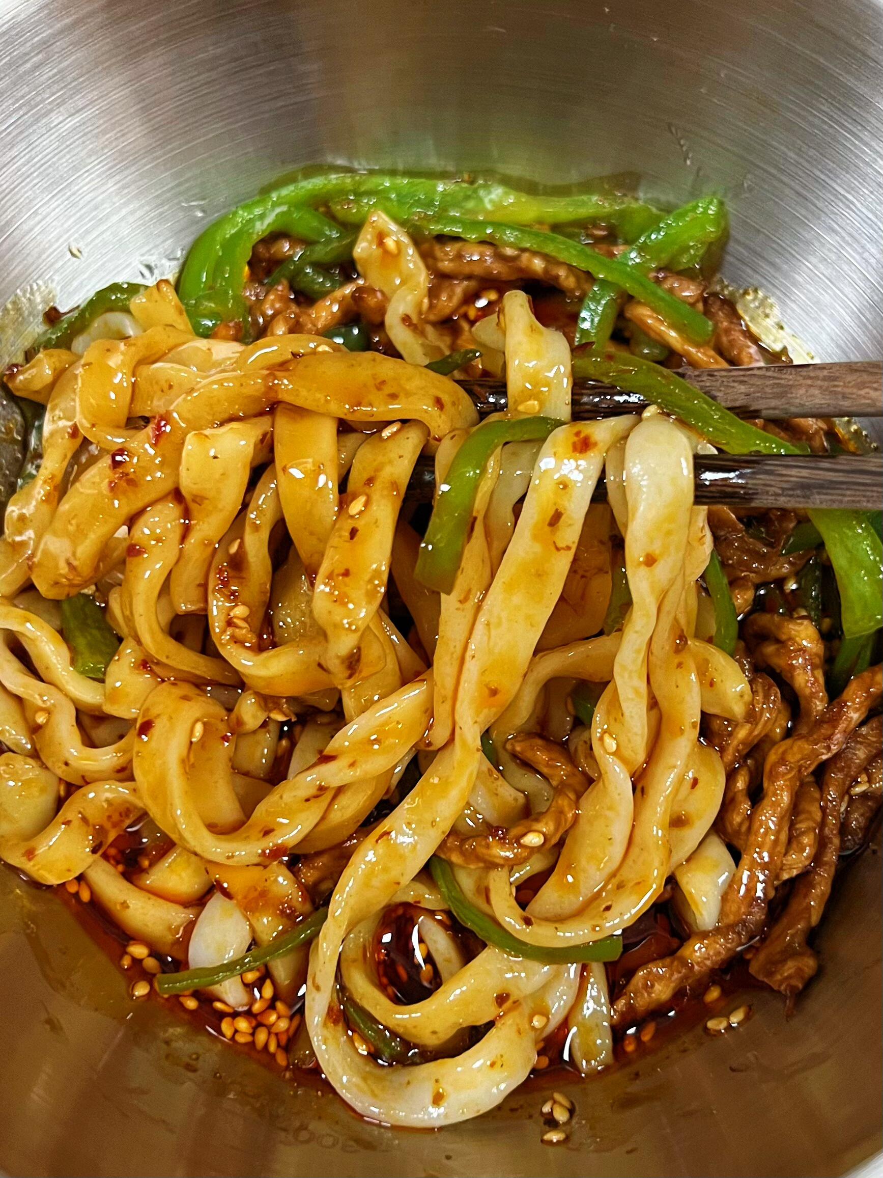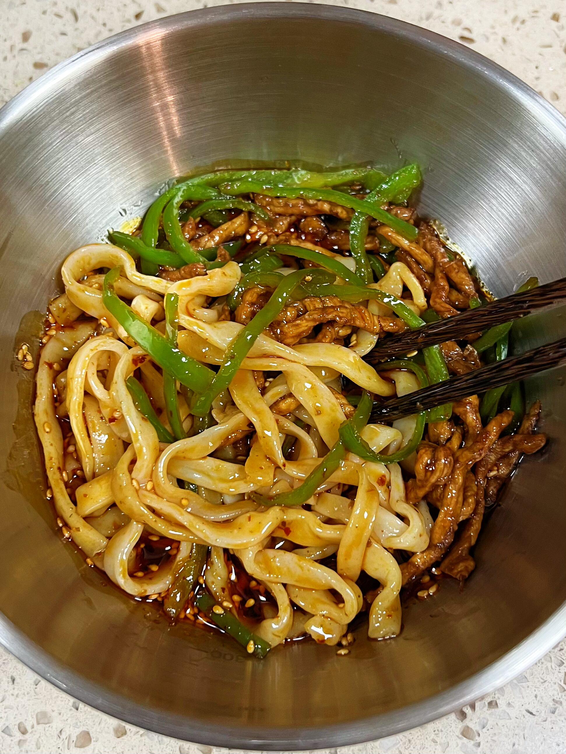 夹起一筷子面条,送入口中,那滋味,简直了!面条爽滑有嚼劲,酱料浓郁而不腻,青椒清脆爽口,肉丝鲜嫩多汁。每一口都是满满的幸福感,每一口都是对家的思念。