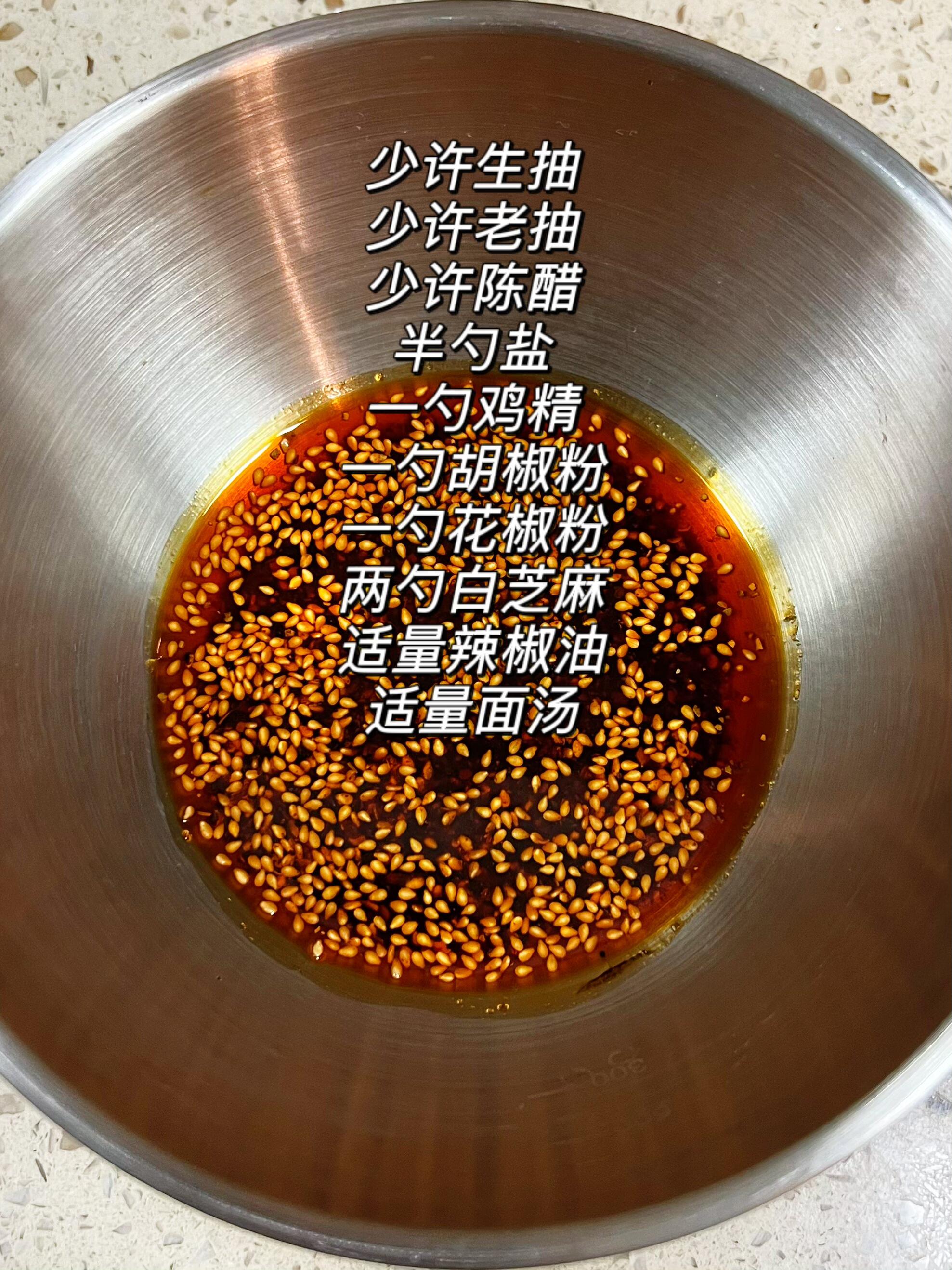 做这道面,其实很简单。首先,我们需要调一碗万能的酱料。取一个小碗,加入少许生抽提鲜,老抽上色,陈醋增添一丝酸爽,半勺盐调味,一勺鸡精提味,再撒上一些胡椒粉和花椒粉,增添层次感。然后,加入两勺白芝麻,让酱料更加香浓。最后,根据个人口味,加入适量的辣椒油,让酱料变得红亮诱人。别忘了,还要加一些面汤水,让酱料更加柔和,更容易包裹在面条上。