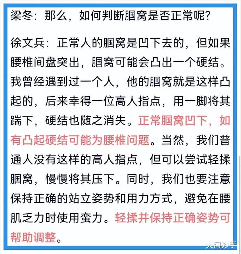 徐文兵老师见多识广,他在梁冬的访谈节目中,曾谈起曾得到一位高人指点,踹没了腘窝的硬结,解除了腰椎的问题。