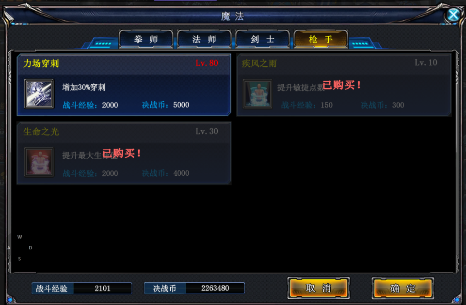 疾风之雨:10级解锁购买;核心增益技能,提升角色敏捷。