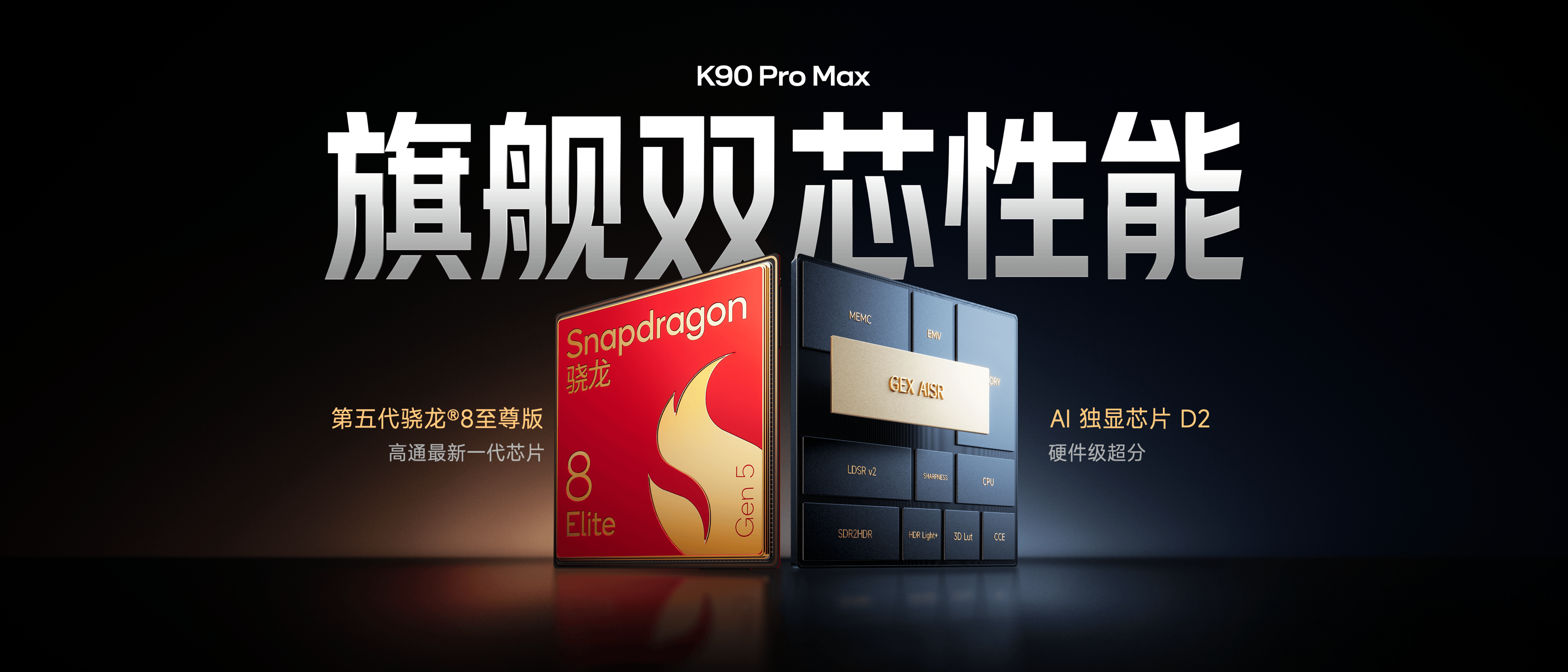 REDMI K90 Pro Max 搭载第五代骁龙 8 至尊版处理器与 AI 独显芯片D2,构成“最强性能双芯”。第五代骁龙 8 至尊版采用领先的3nm制程与第三代Oryon CPU架构,最高主频达4.6GHz。独显芯片D2则创新性地加入独立硬件AI模块,支持硬件级AI超分与自研动态插帧技术,升级PC级AI超分,并实现接近原生高帧的流畅体验。