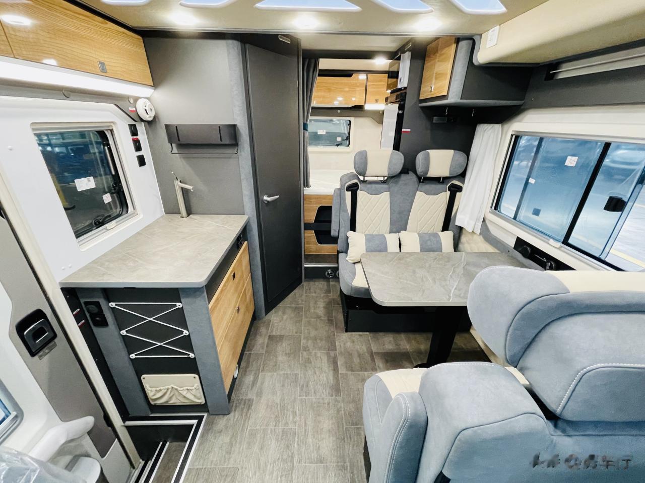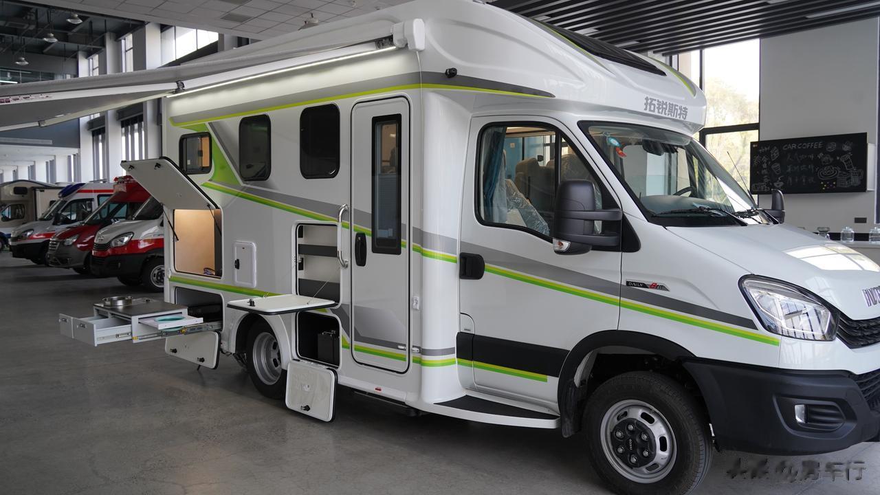 【4月1-3日南京国际房车展】 拓锐斯特房车——旅行者T型 基于依维柯欧胜国六4.5吨底盘打造,有着出色的通过性、别具一格的空间收纳设计以及超高的配置,让新车一经发布便成为拓锐斯特房车又一标志性明星产品。新车外尺寸为5995x2498x2990mm,轴距3300mm,满足蓝牌C本驾驶的要求。