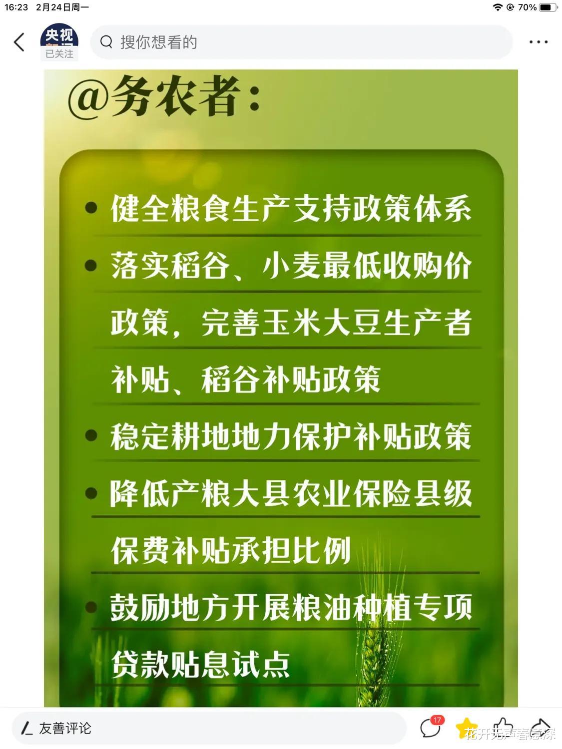 首先第一个是针对在农村务农的农民,说到这个大家都应该有直观的感受吧,现在农村种地耕田的已经没有多少是年轻人了,都是中老年人比较多,针对这一部分人,将会落实稻谷,小麦的最低收购价,完善大豆生产者补贴,稻谷补贴政策。让这些农民朋友,能够通过这些新的政策,增加耕种的收入。这可是实打实的好处。