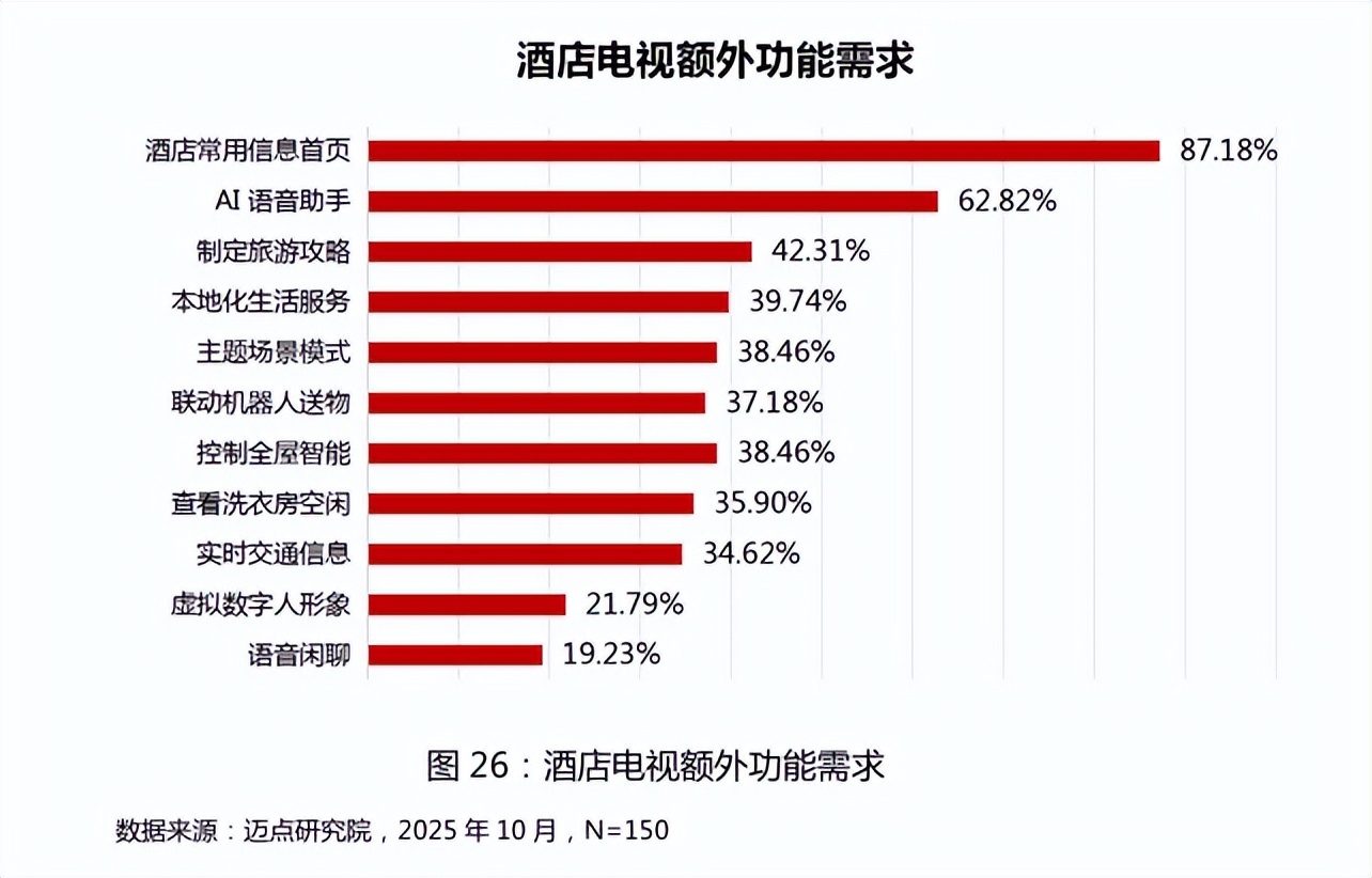 同时,酒店的采购逻辑正在发生根本性变化。过去,酒店关注屏幕尺寸、分辨率等硬件参数;现在,更看重电视能否为运营赋能。调研数据显示,87.18%的酒店希望电视首页直显实用信息,62.82%的酒店需要AI语音助手实现与客房控制系统的联动。这表明硬件只是基础,软件功能与服务能力已成为酒店选择品牌的核心考量。