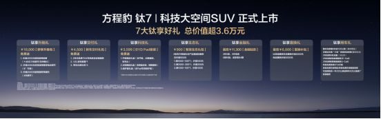 在购车权益上,方程豹更是诚意十足,为首批车主带来了总价值最高超3.6万元的7大钛享好礼!其中包括:覆盖多项座椅舒适配置的总价值10000元舒享升级包、价值3599元的BYD Pad套装、价值4500元的新车交付礼包均免费送;提供3年0息、5年低息、0首付起或至高84期等多重金融方案以供选择,金融贴息最高价值11300元;还有最高价值6000元的置换补贴、价值900元的智慧生态礼包,以及2年5G每个月的免费车机流量、非营运车辆长达6年或15万公里的整车包修、“三电”系统的终身保修、终身免费系统OTA升级等,让每一个家庭都能轻松拥抱钛7,让美好生活触手可及。