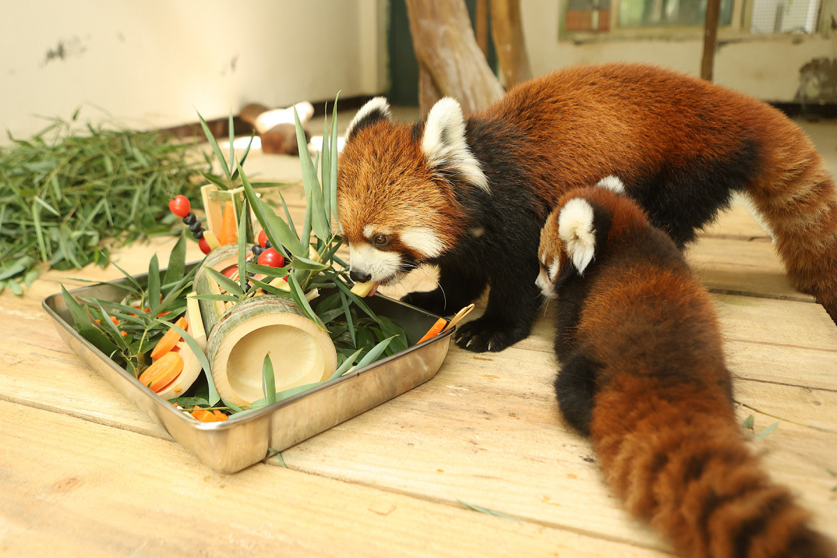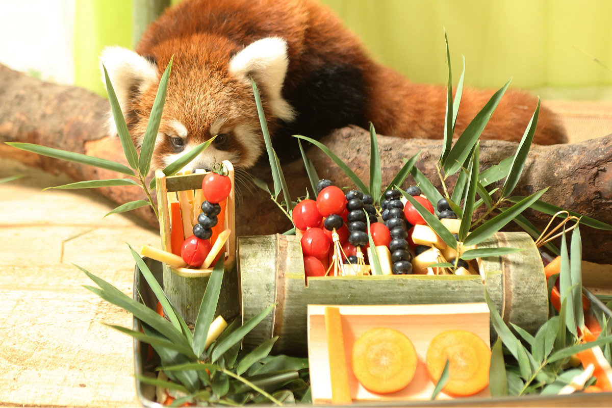 百天宴怎么能没有美食呢?工作人员把胡萝卜、苹果、竹笋、蓝莓、小番茄等食物一部分切成条装进了竹筒,一部分串成了糖葫芦状。但因为小家伙们还在吃奶,所以美食就由妈妈替它们来品尝,这些食物可太对妈妈们的胃口了,一看到美食就大口大口的狂炫起来。
