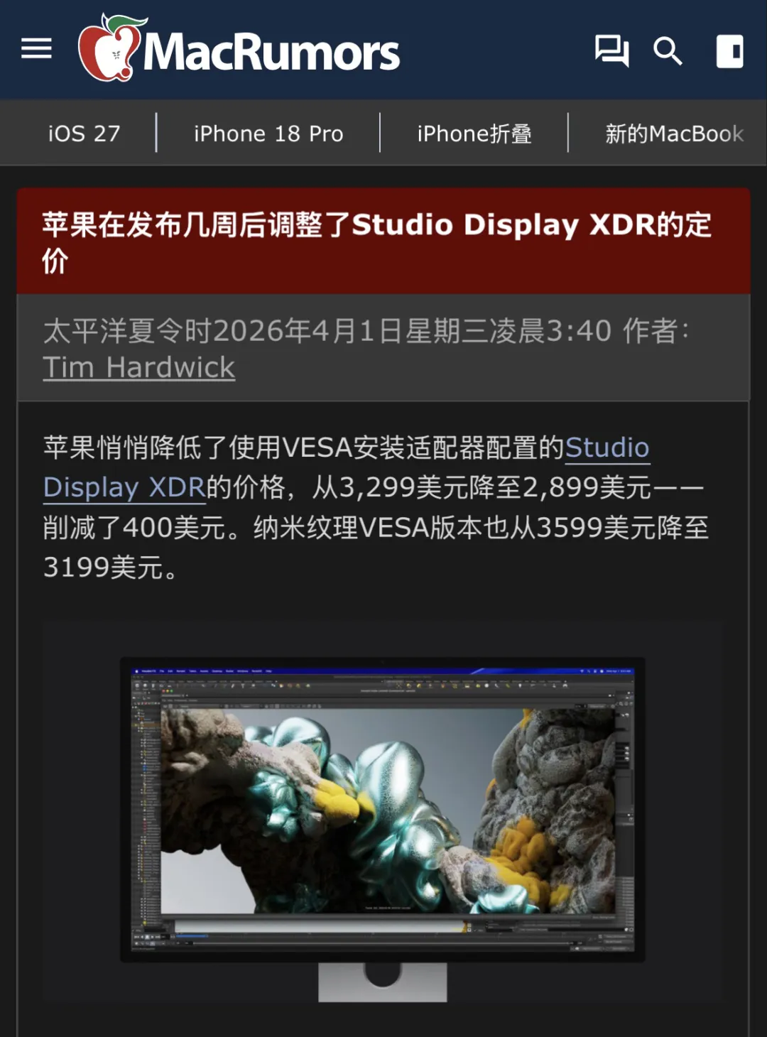 值得一提的是,虽然昨天(4月1日)是愚人节,但此次新款Studio Display XDR显示器VESA支架转换器版的价格下调真实有效,并非恶作剧。